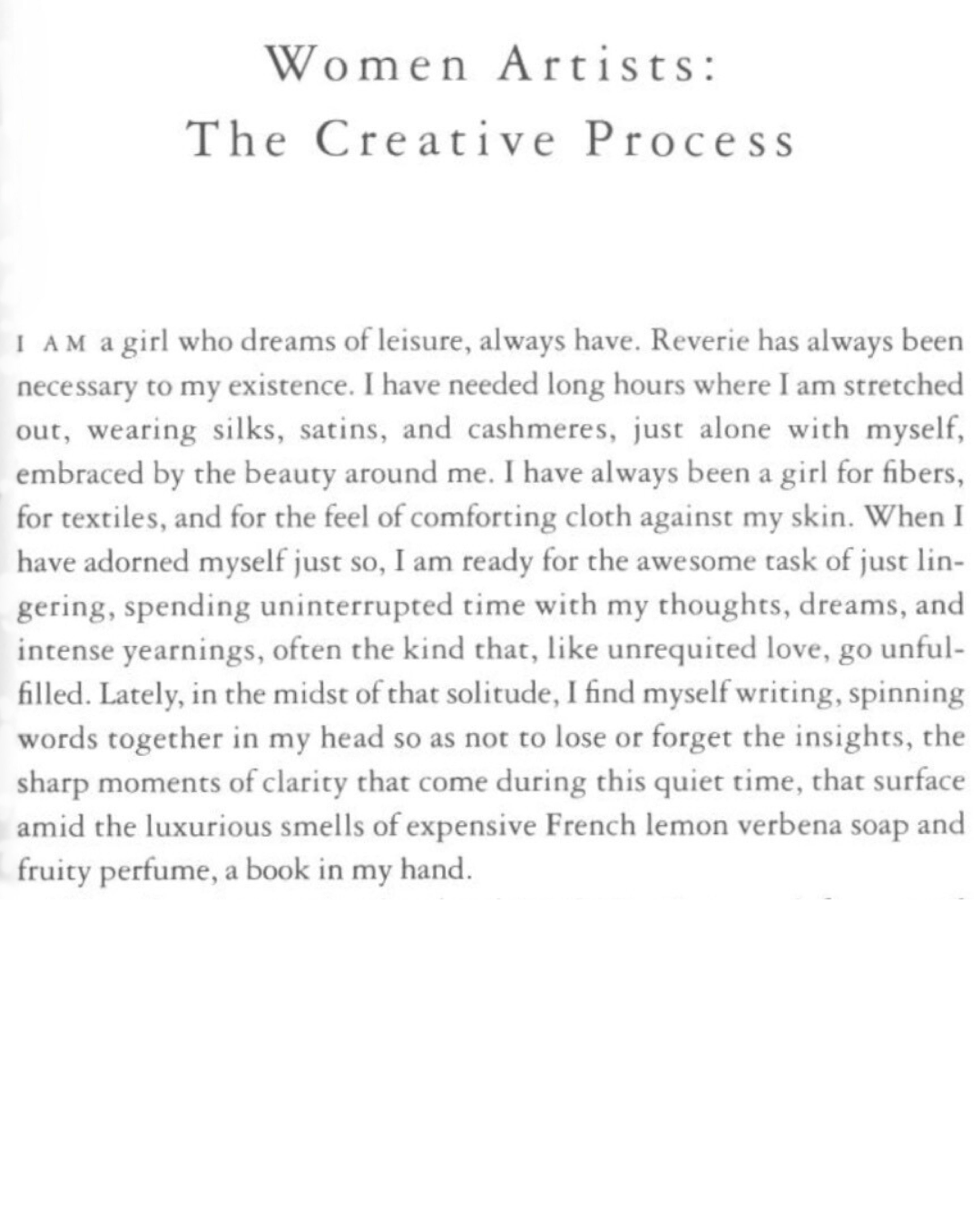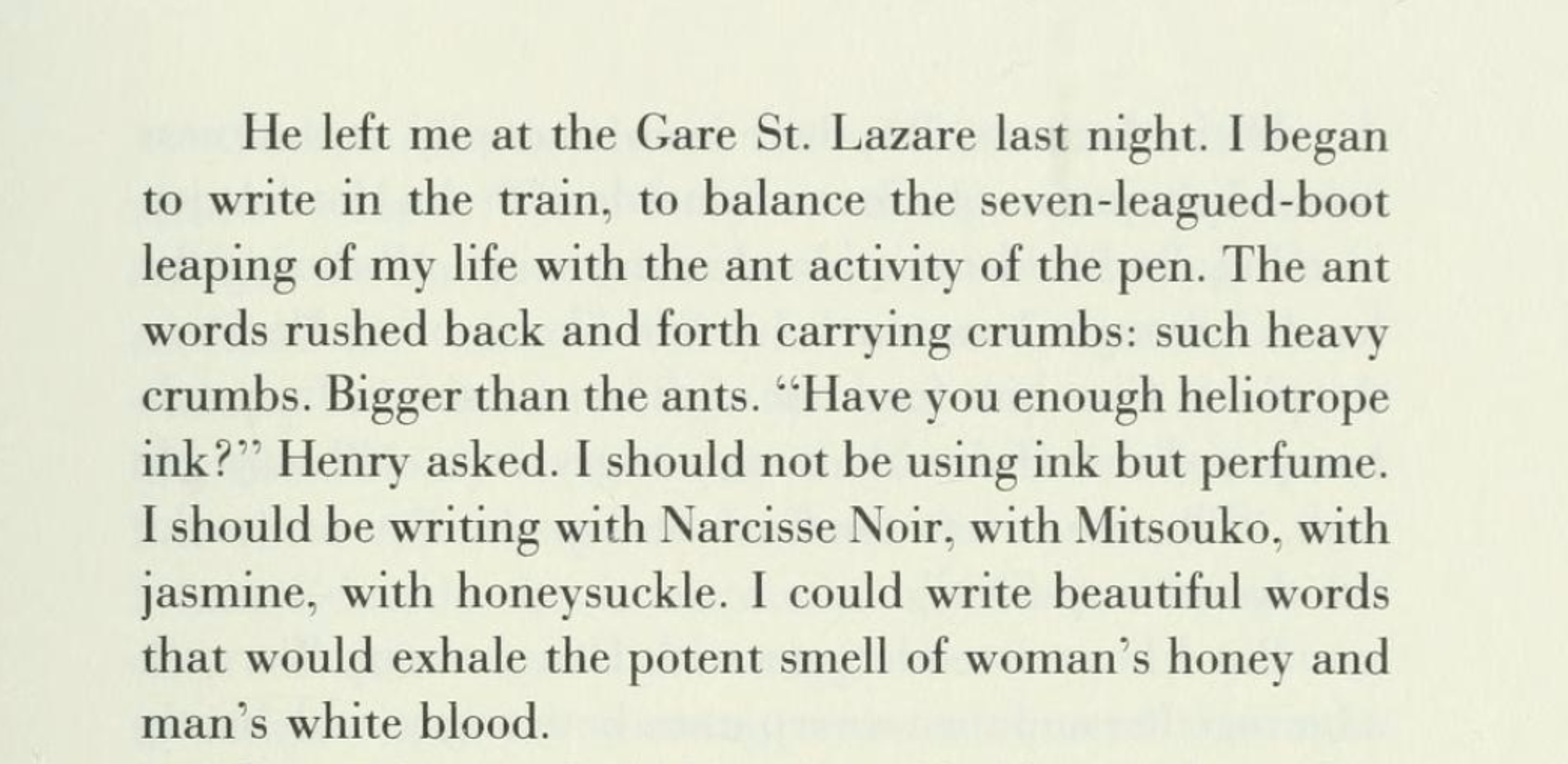 Clarice Lispector said "to write you I first cover myself with perfume". Anaïs Nin's necessities included "good coffee, on lacquered trays... silk stockings and perfume". bell hooks' moments of clarity came "amid the luxurious smells of expensive French lemon verbena soap".