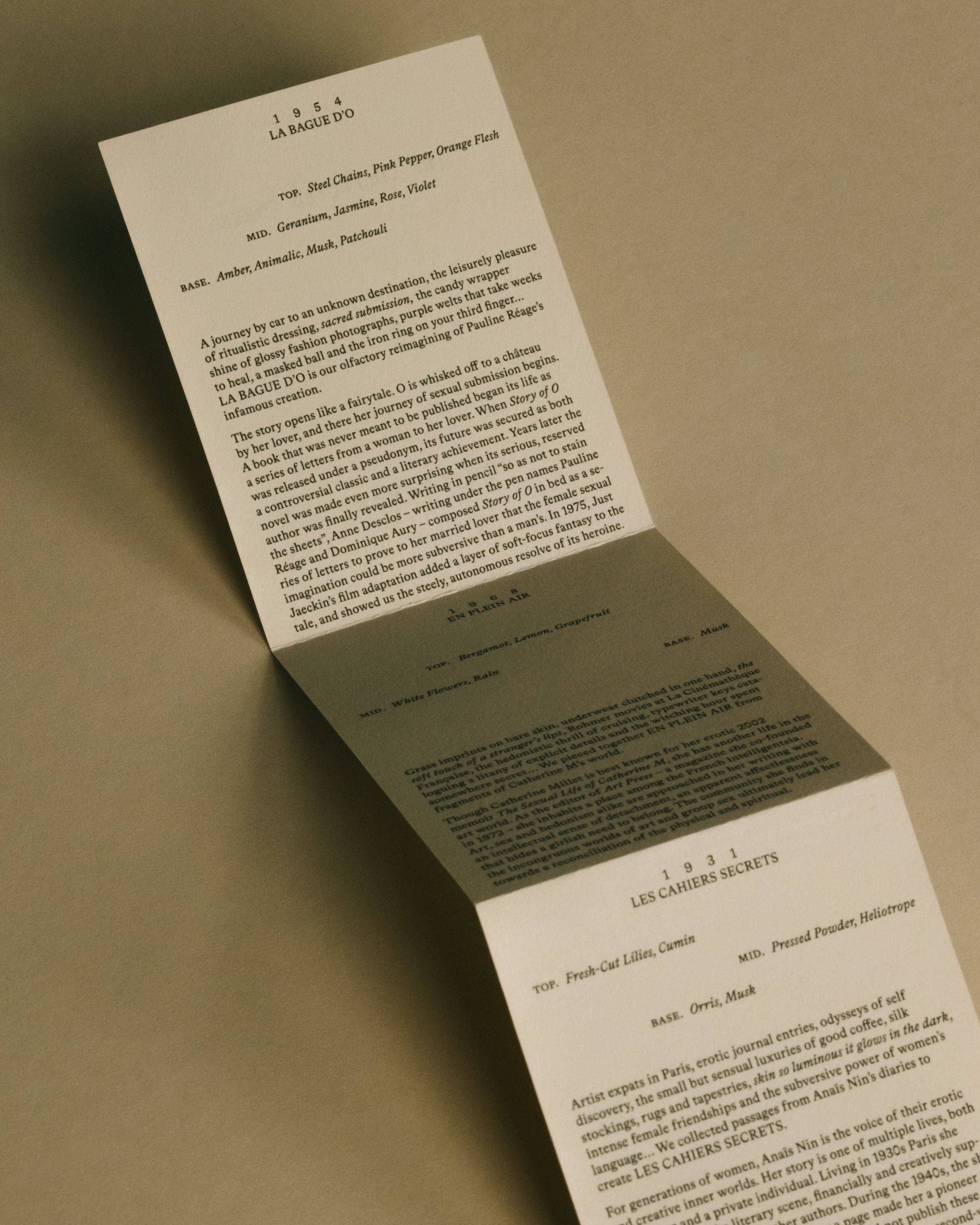 "Les Cahiers Secrets sits incredibly close on the skin, making itself known only to you and those within your close orbit. It captures the vintage feel of silk stockings, face powder and soft sheets while still feeling au courant."