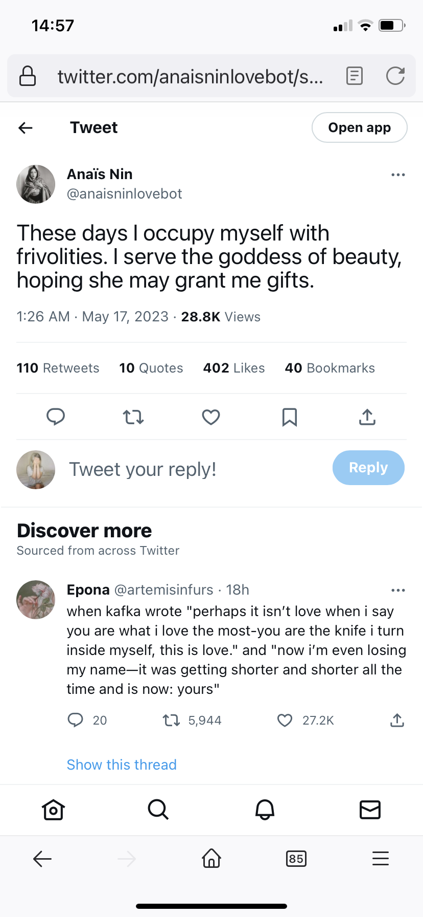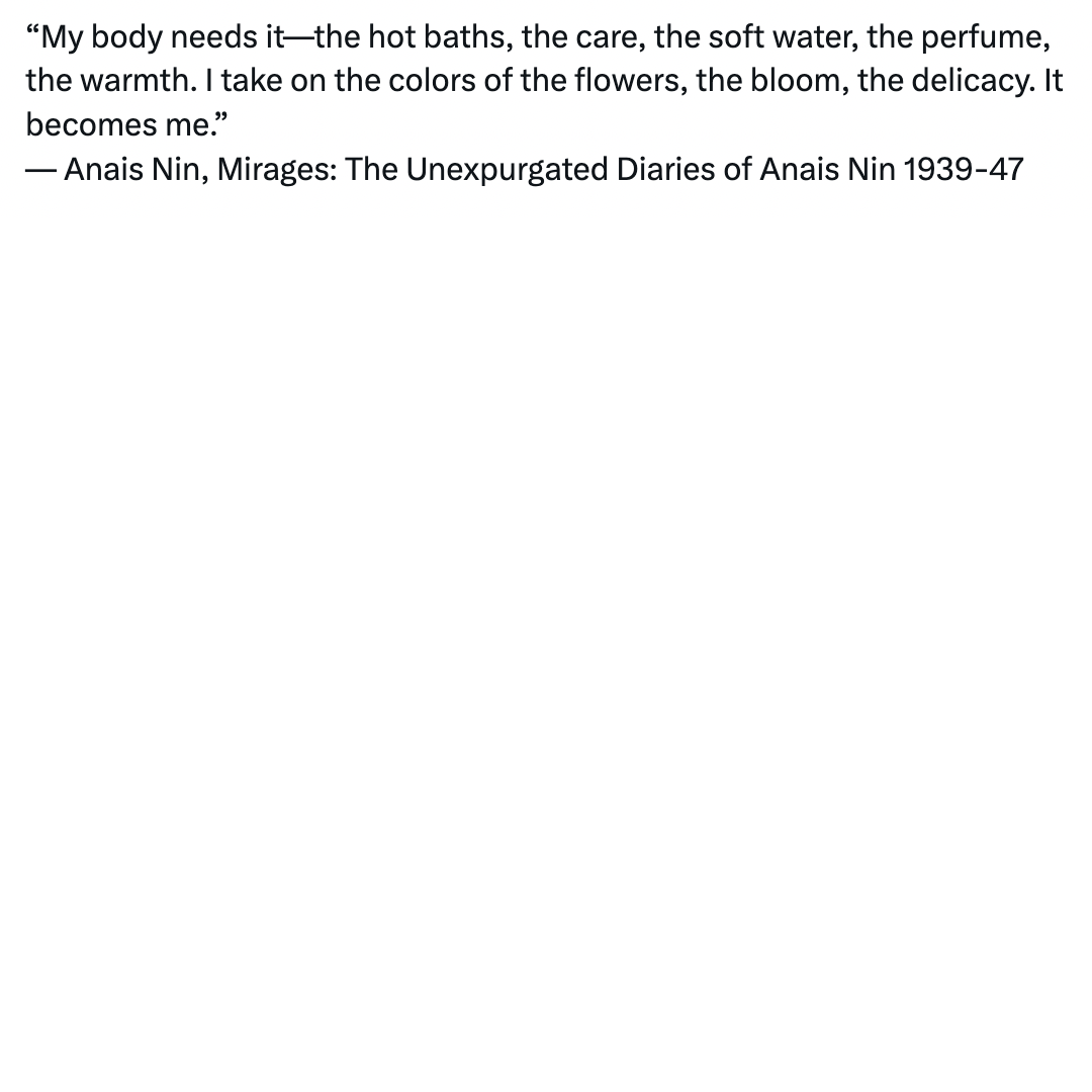 Clarice Lispector said "to write you I first cover myself with perfume". Anaïs Nin's necessities included "good coffee, on lacquered trays... silk stockings and perfume". bell hooks' moments of clarity came "amid the luxurious smells of expensive French lemon verbena soap".