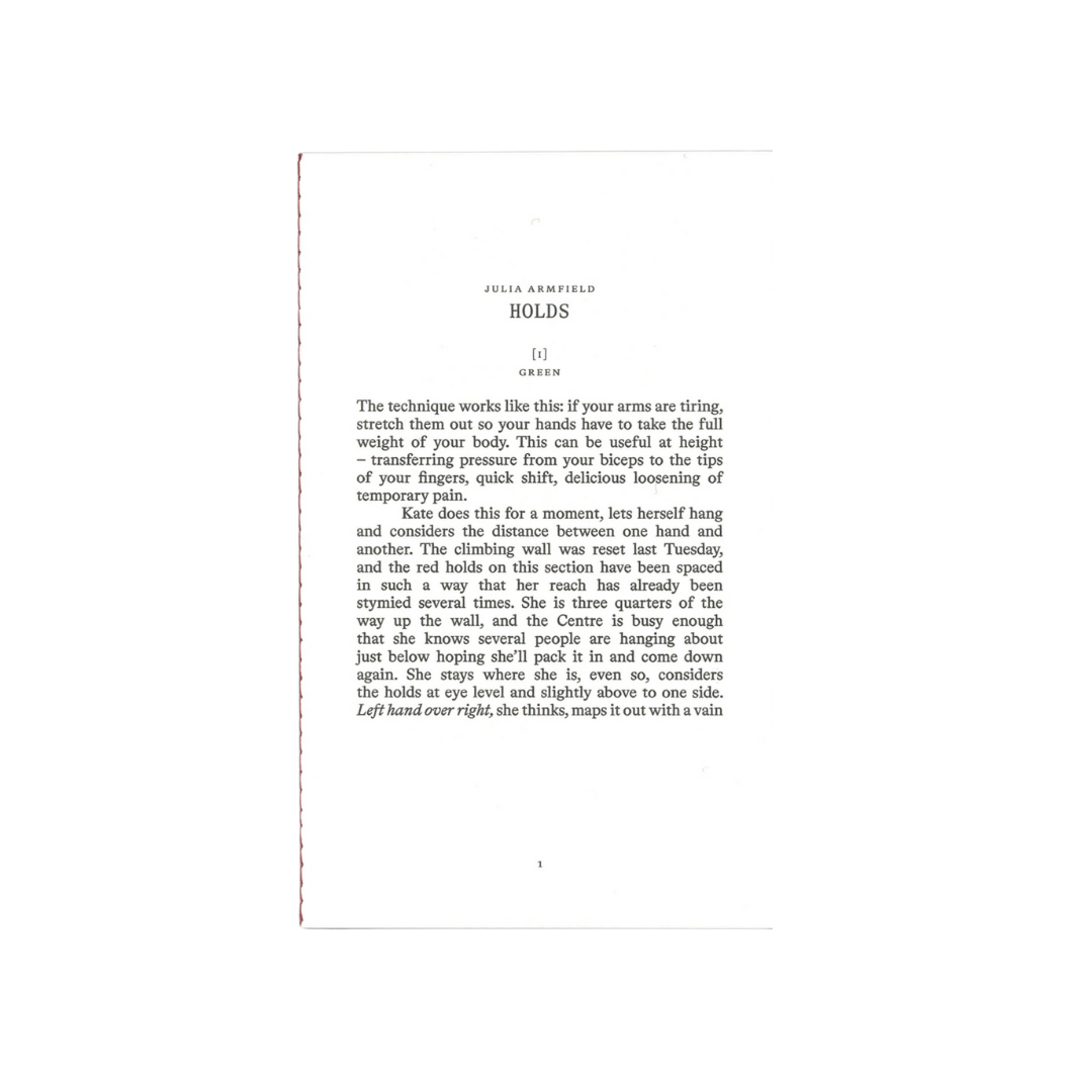 Kate does this for a moment, lets herself hang and considers the distance between one hand and another. The climbing wall was reset last Tuesday, and the red holds on this section have been spaced in such a way that her reach has already been stymied several times. She is three quarters of the way up the wall, and the Centre is busy enough that she knows several people are hanging about just below hoping she’ll pack it in and come down again. She stays where she is, even so, considers the holds at eye level and slightly above to one side. Left hand over right, she thinks, maps it out with a vain sort of logic, and then slide to the left, and then up. Only that hold has no grip and the other’s too sheer to be trusted, and I can’t see my way up from here. She thinks this, imagines the swing of a body in motion. Climbing, she often feels, is one thing when you’ve already done it and quite another when you still have some distance to go. How she managed to get up this far has already dissolved into something like fantasy – she used her arms, she imagines, and her legs, and she moved up the wall the way anyone would, but beyond that the sequence of holds and of movement collapses into a sort of witless geometry and she cannot imagine how she will move further up.
