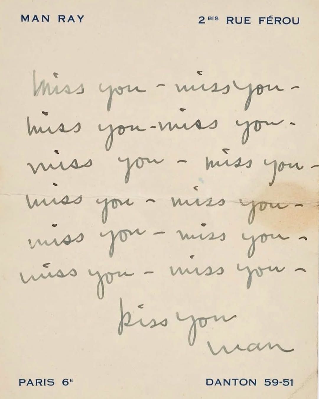 Rather than springing from a rapturous union, love letters exist precisely due to distance. It is separation, one's lover's inaccessibility, that moves ink to transfer onto paper. There’s the short and sweet style adopted by Man Ray, writing to Lee Miller from his home studio, featuring 10 scribbled "miss yous" and signed off, simply: