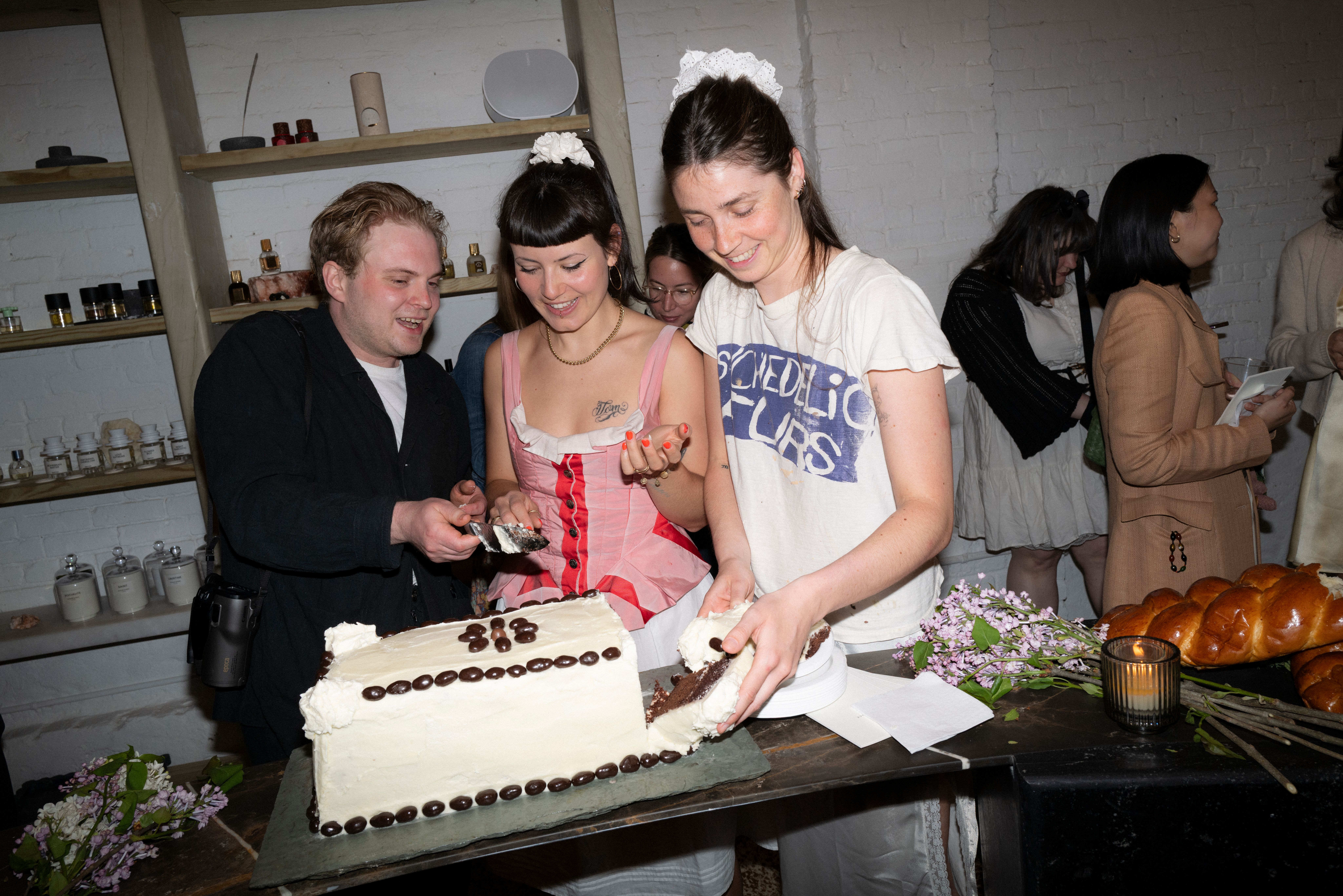 Jago Rackham of Ecstasy Cookbook, Nico Lou, and Lili serving cakes to guests.