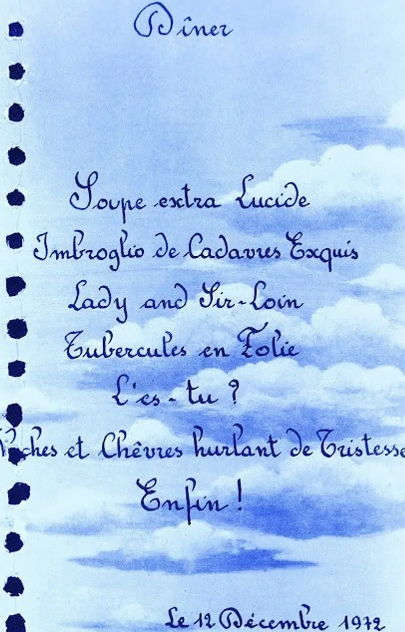 Handwritten menu for the Rothschild Surrealist Ball.