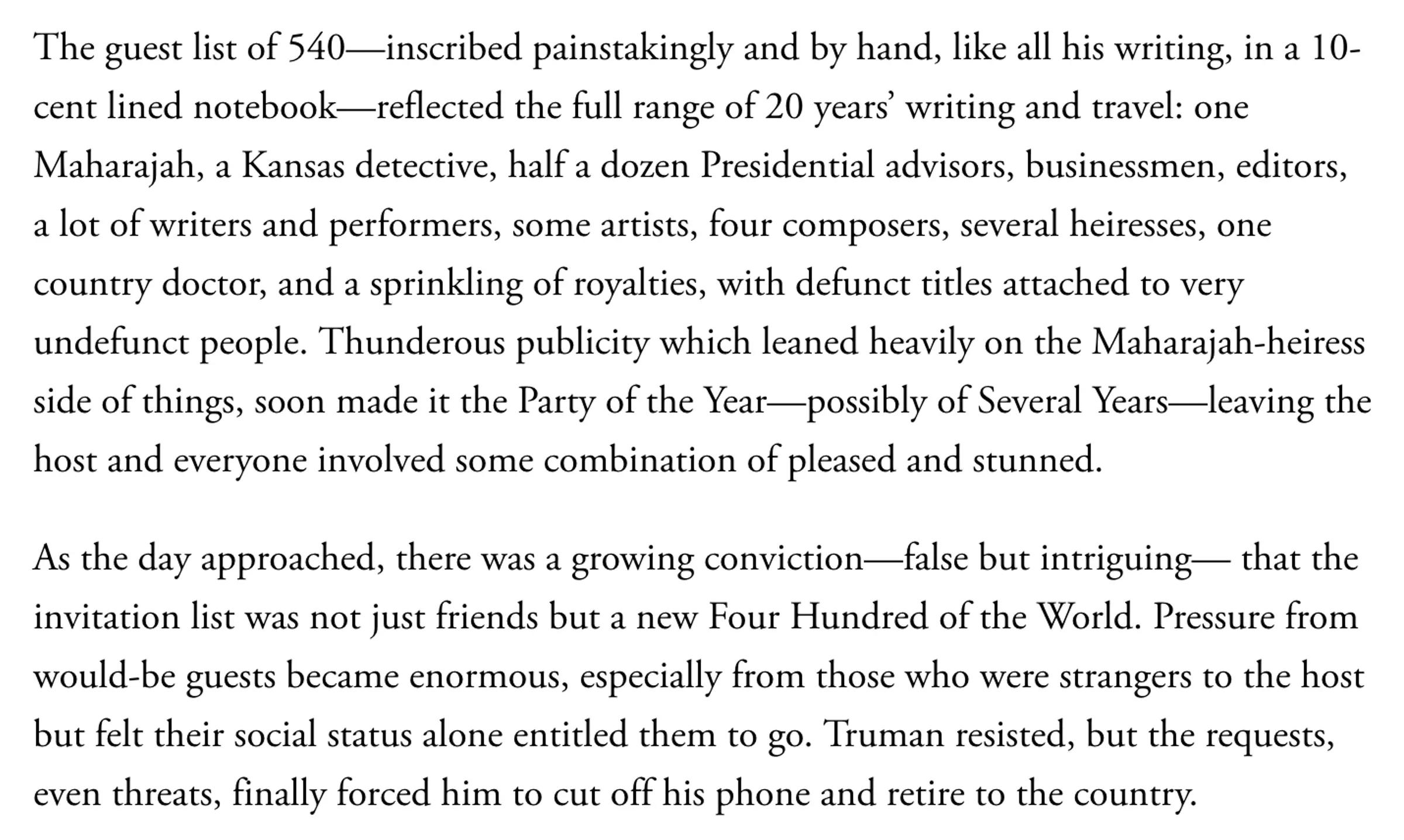 The best parties are the ones you didn’t attend, so keep the intrigue alive and the outsiders guessing by curating your guest list with precision. Limit your guest list to a single zodiac sign, as Grace Kelly did with her 40th Birthday Scorpio Ball. Or take a page from Truman Capote’s playbook and craft a delightfully idiosyncratic roster, as he did for his Black and White Ball, inviting 540 of what he simply called “the people I like”. Gloria Steinem, writing for Vogue, recounted how Capote had to disconnect his phone in the weeks before the event, fending off pleas from those desperate to secure an invitation.