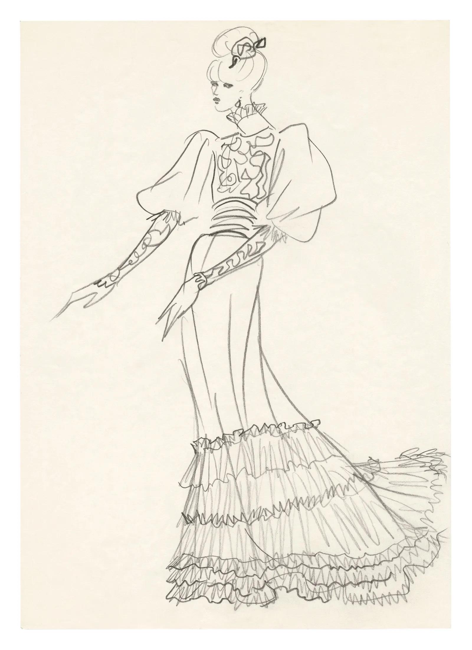 Yves' Saint Laurent's sketch of Jane Birkin's Bal Proust costume.