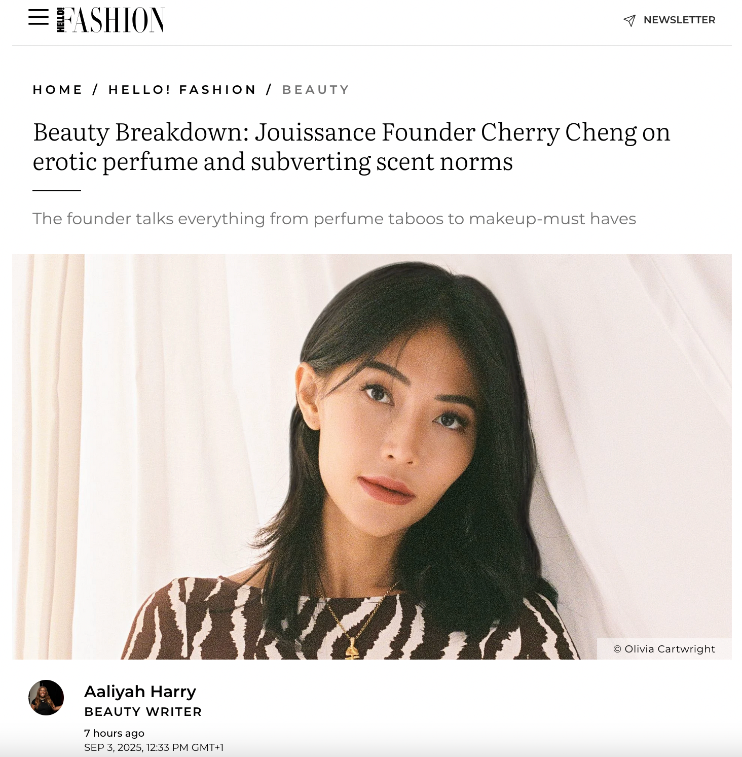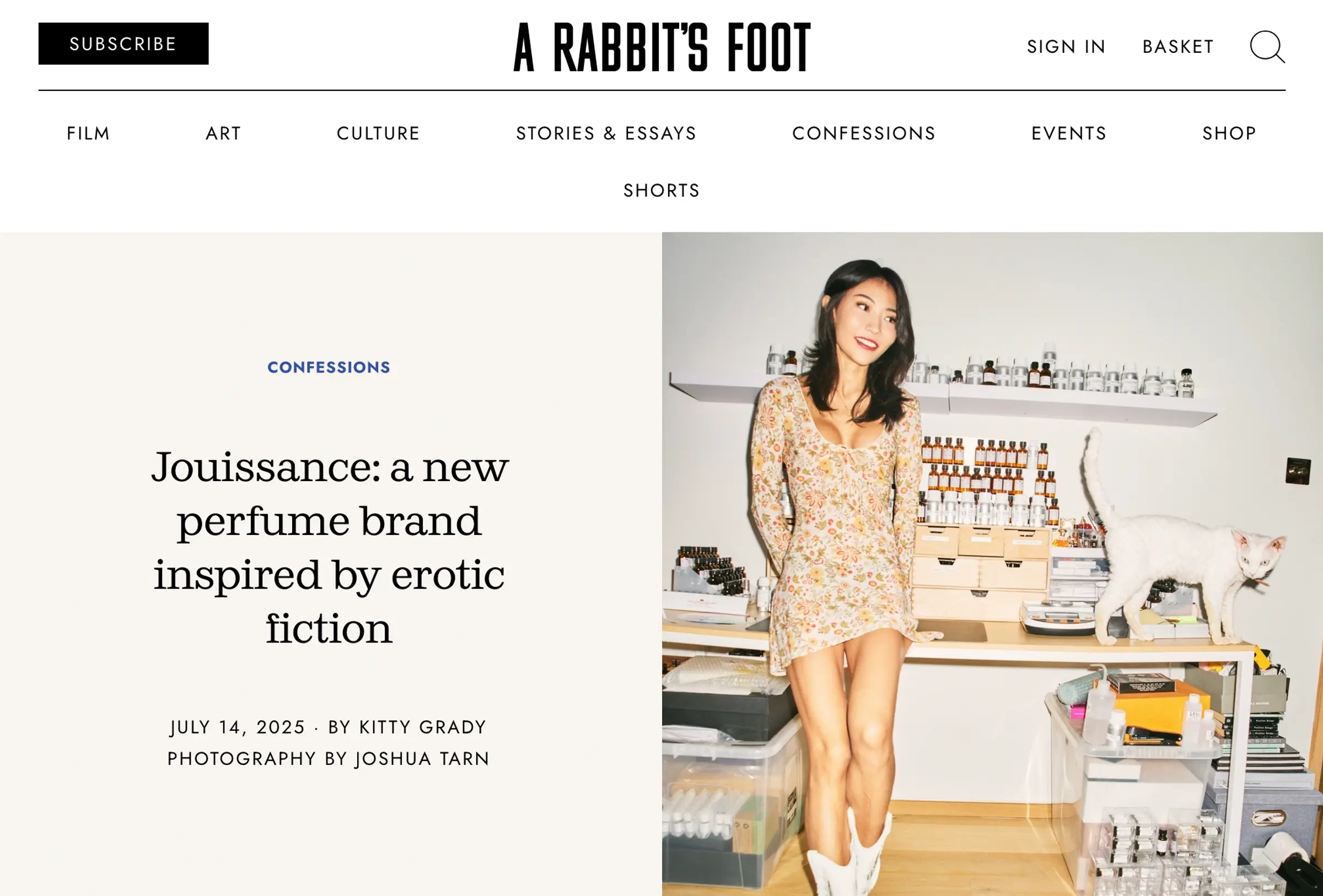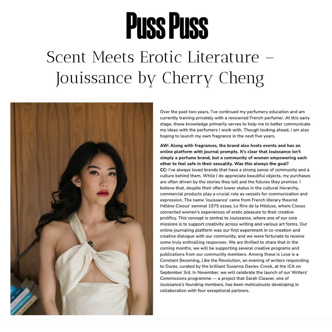 Cherry Cheng always longed for a perfume that centred the female gaze so, she created her own in 2023. Jouissance Parfumes is a subversive perfume brand translating erotic literature into scents, with the female gaze in mind. Inspired by classic vintage perfumes and books we read beneath the sheets, celebrating the female artists, writers and fictional characters who taught us to fantasise and to desire.