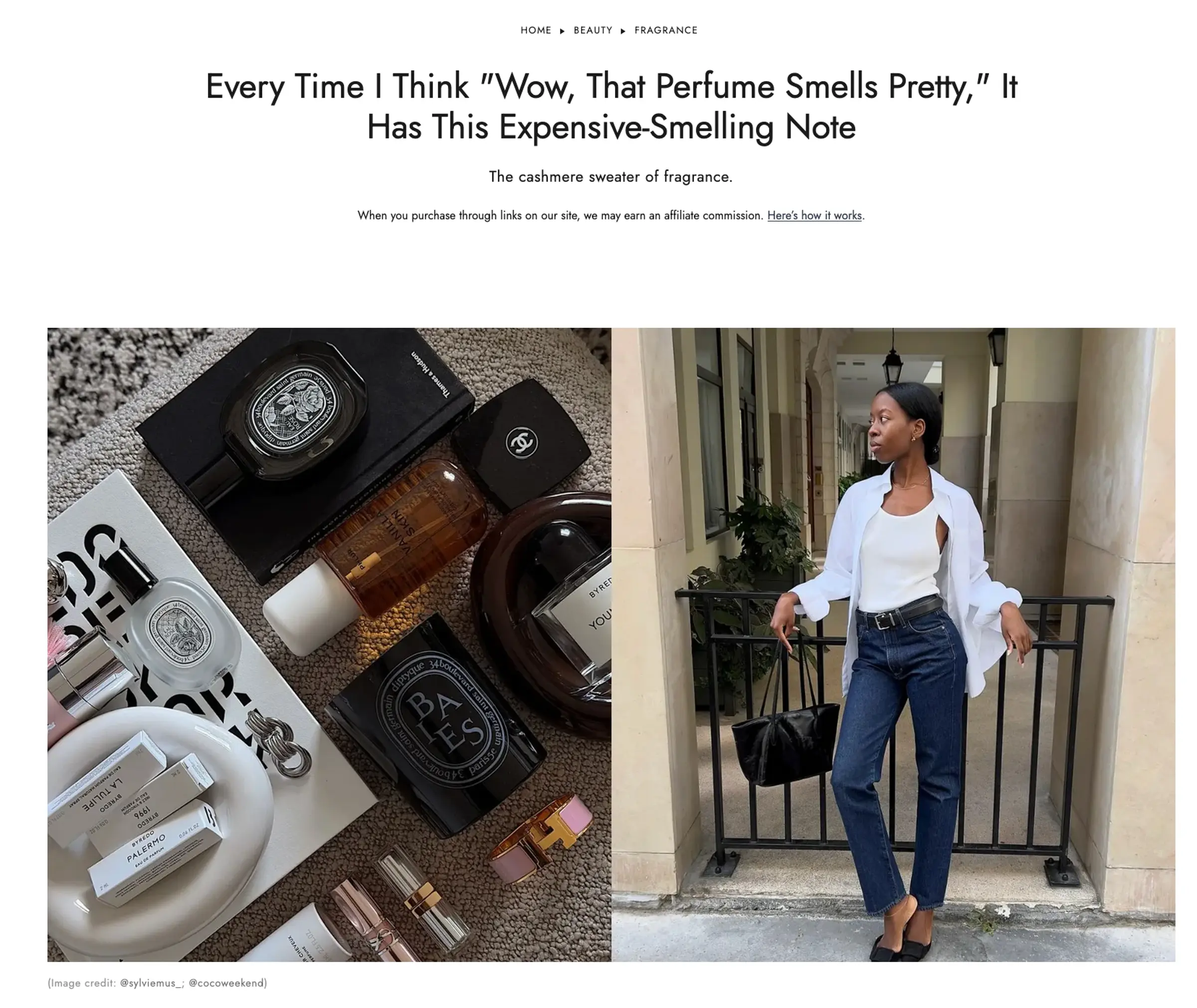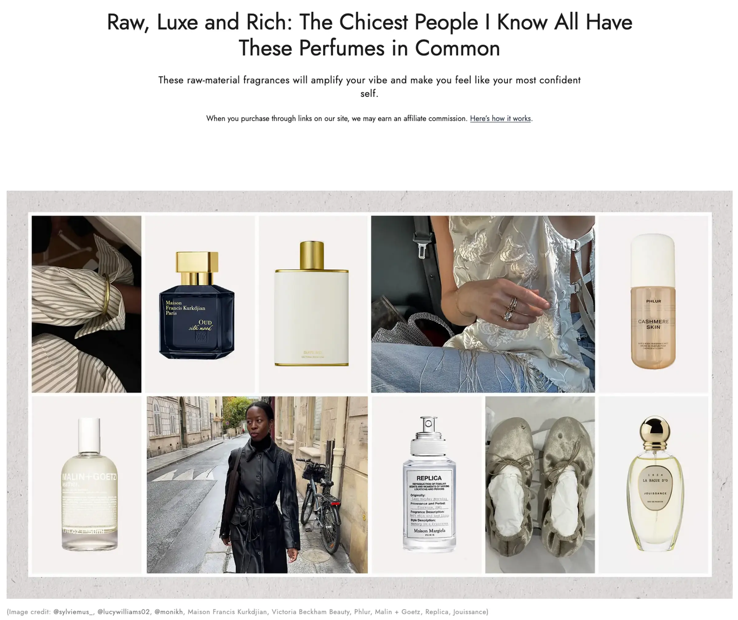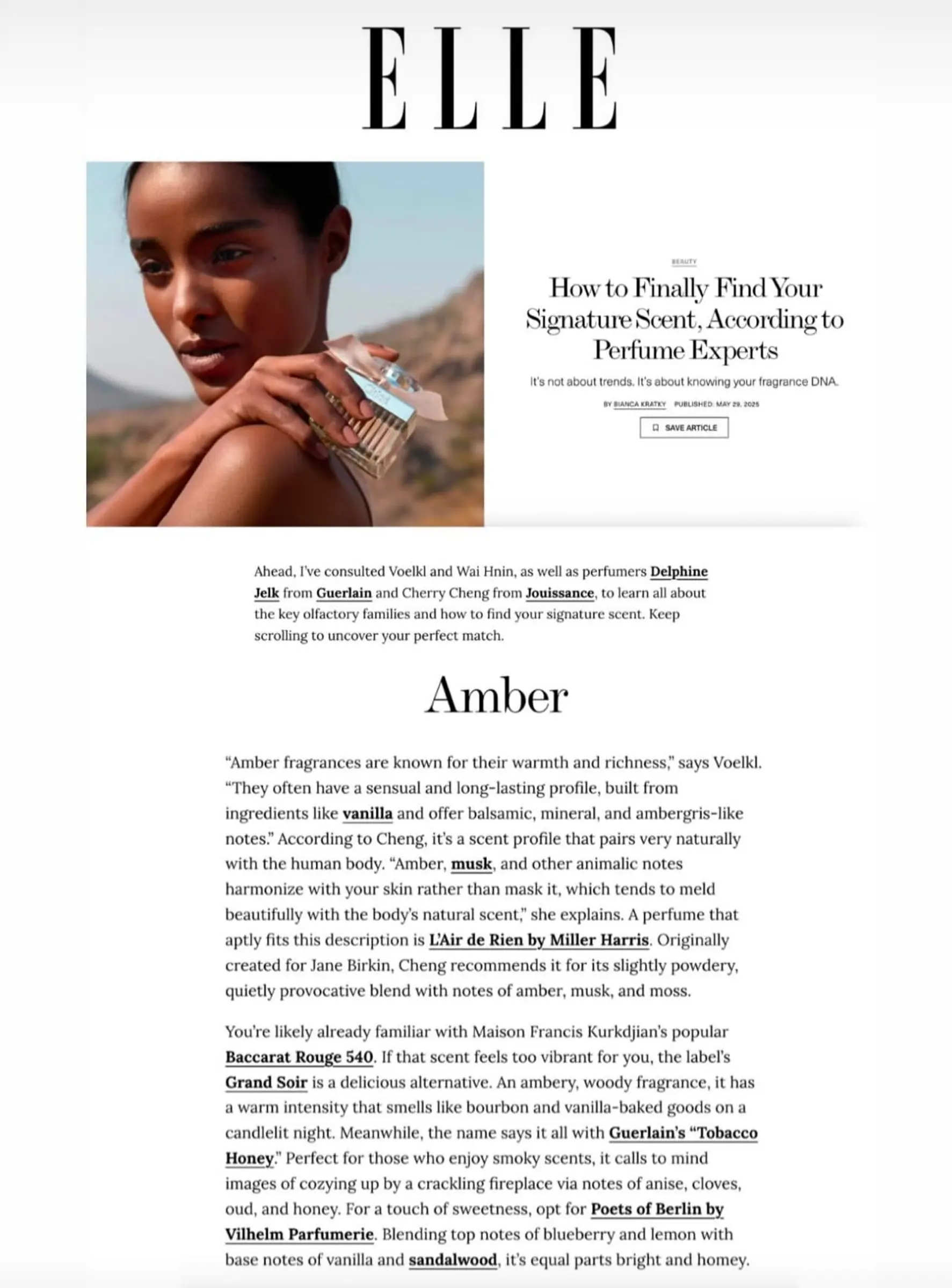 “Amber fragrances are known for their warmth and richness,” says Voelkl. “They often have a sensual and long-lasting profile, built from ingredients like vanilla and offer balsamic, mineral, and ambergris-like notes.” According to Cheng, it’s a scent profile that pairs very naturally with the human body. “Amber, musk, and other animalic notes harmonize with your skin rather than mask it, which tends to meld beautifully with the body’s natural scent,” she explains. A perfume that aptly fits this description is L’Air de Rien by Miller Harris. Originally created for Jane Birkin, Cheng recommends it for its slightly powdery, quietly provocative blend with notes of amber, musk, and moss.