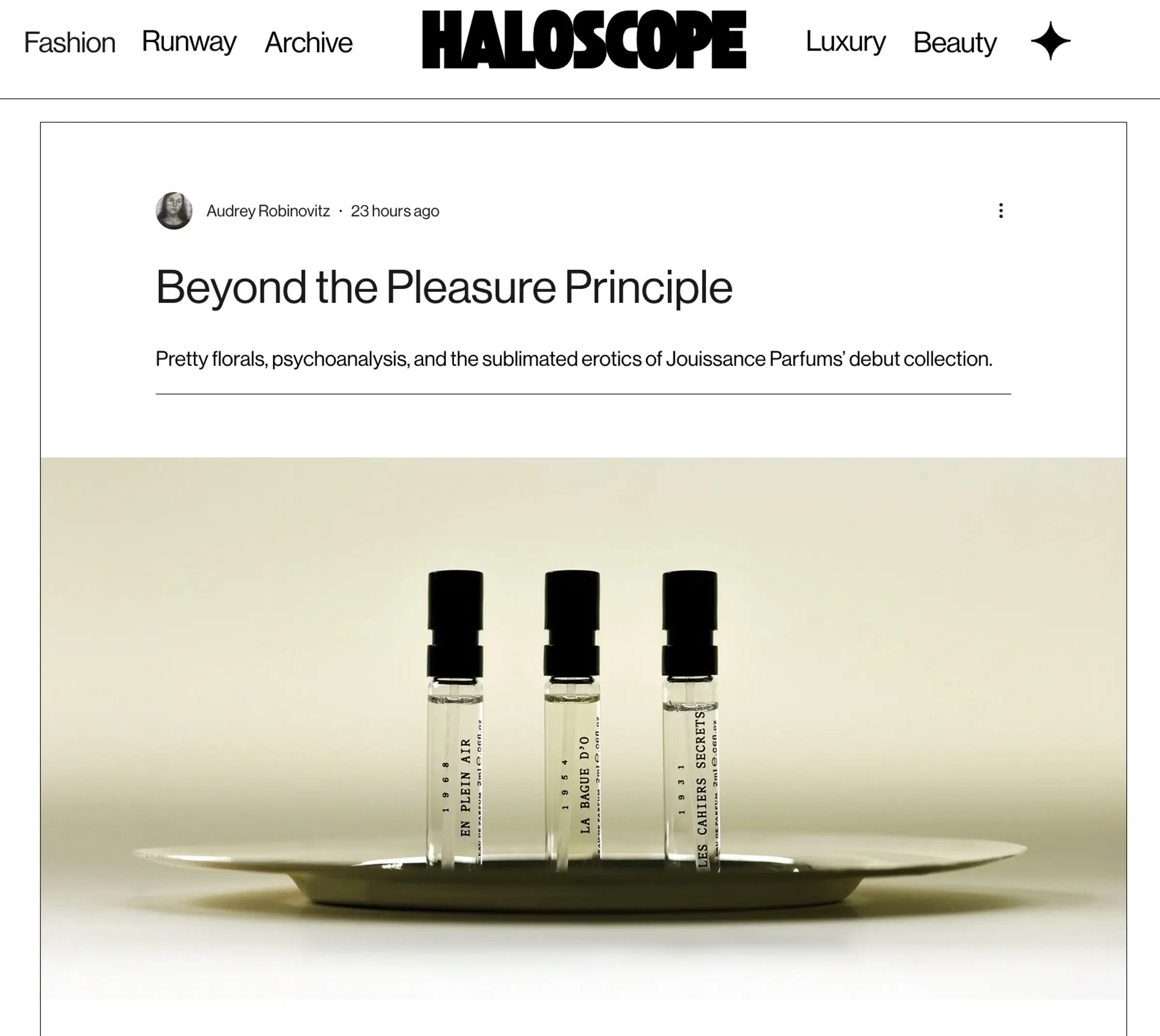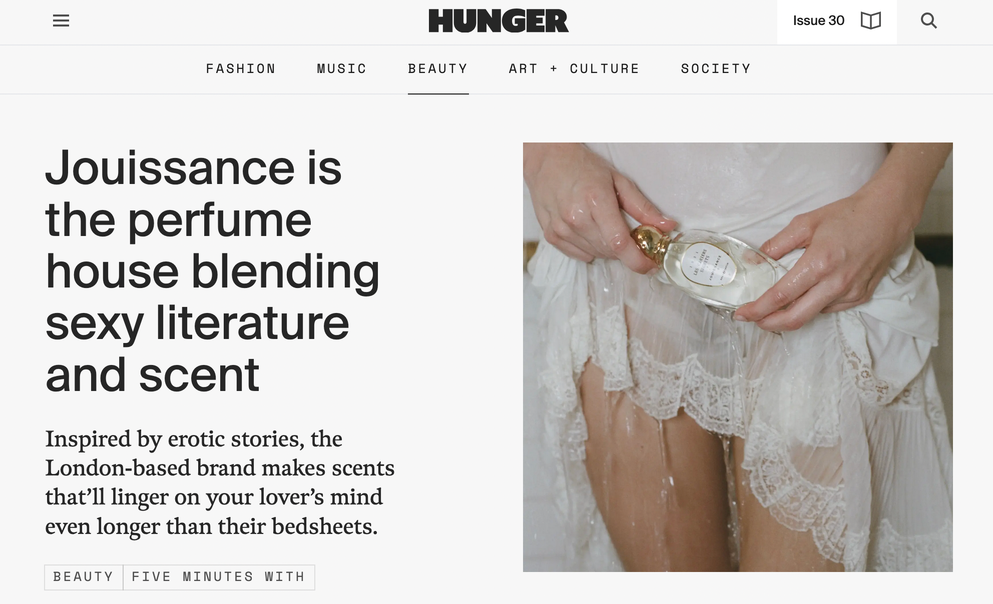 Describing Jouissance as a ‘perfume brand’ almost feels like doing it a disservice. Straddling art, literature, critical theory, eroticism, and more, Jouissance is as much focused on the fragrances it sells as it is the imaginative world built around them.