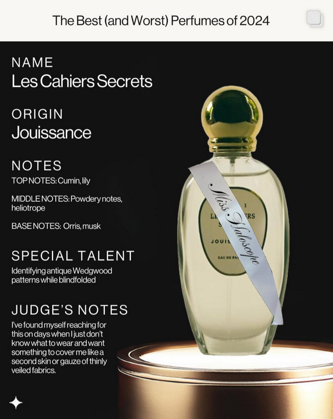 [LES CAHIERS SECRETS] It’s the scent of flushed skin and antique boudoirs, with notes of powdery heliotrope, soft musks and a touch of cumin to keep it from feeling too demure.