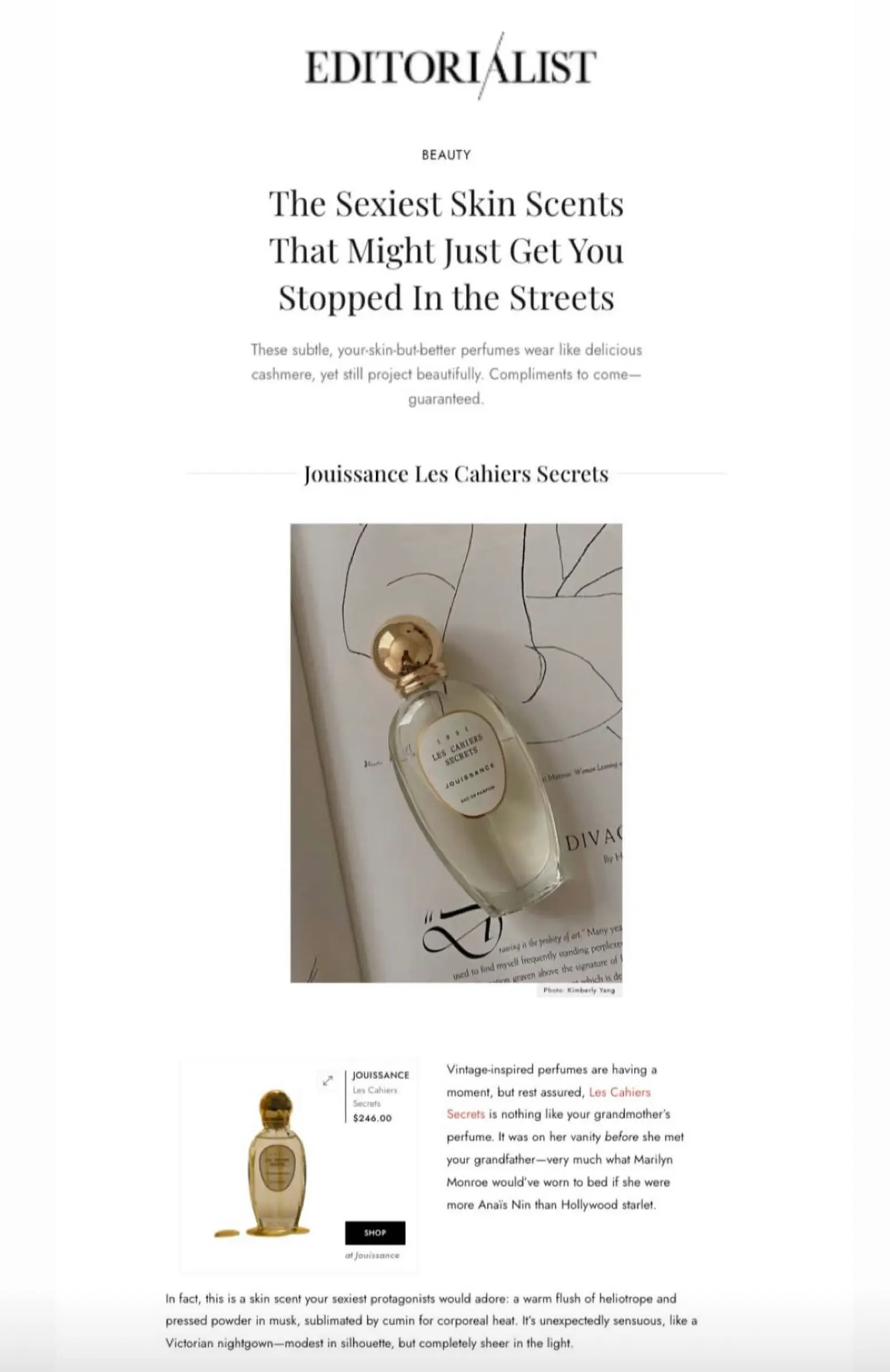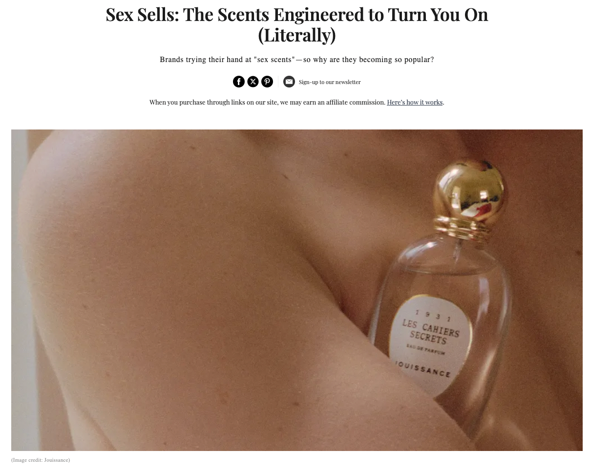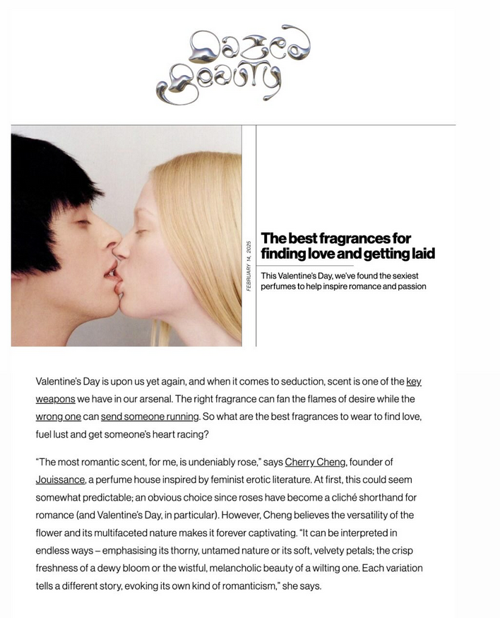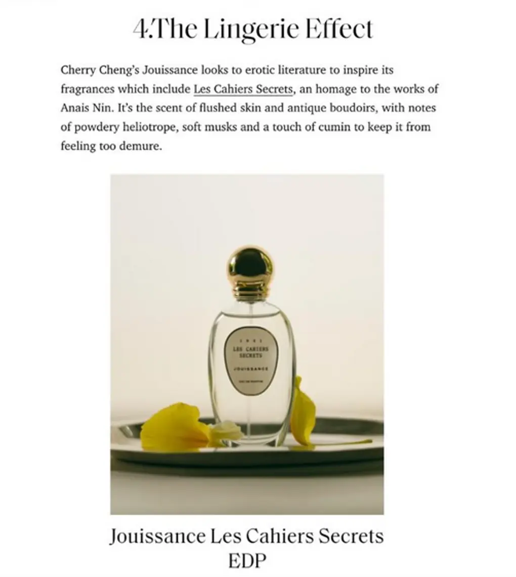 “Fragrances are entering into this space of taking control of sexuality, of owning sexuality and sensuality in a way that’s extremely personal,” [Douglas Little] continued. With this, brands and houses are approaching sexuality in new and innovative ways. For example, Jouissance, a fragrance brand created by Cherry Cheng, offers scents inspired by erotic literature from feminist trailblazers. For Cheng, employing these voices in her products is an intentional pivot from how the fragrance industry has historically approached sex.