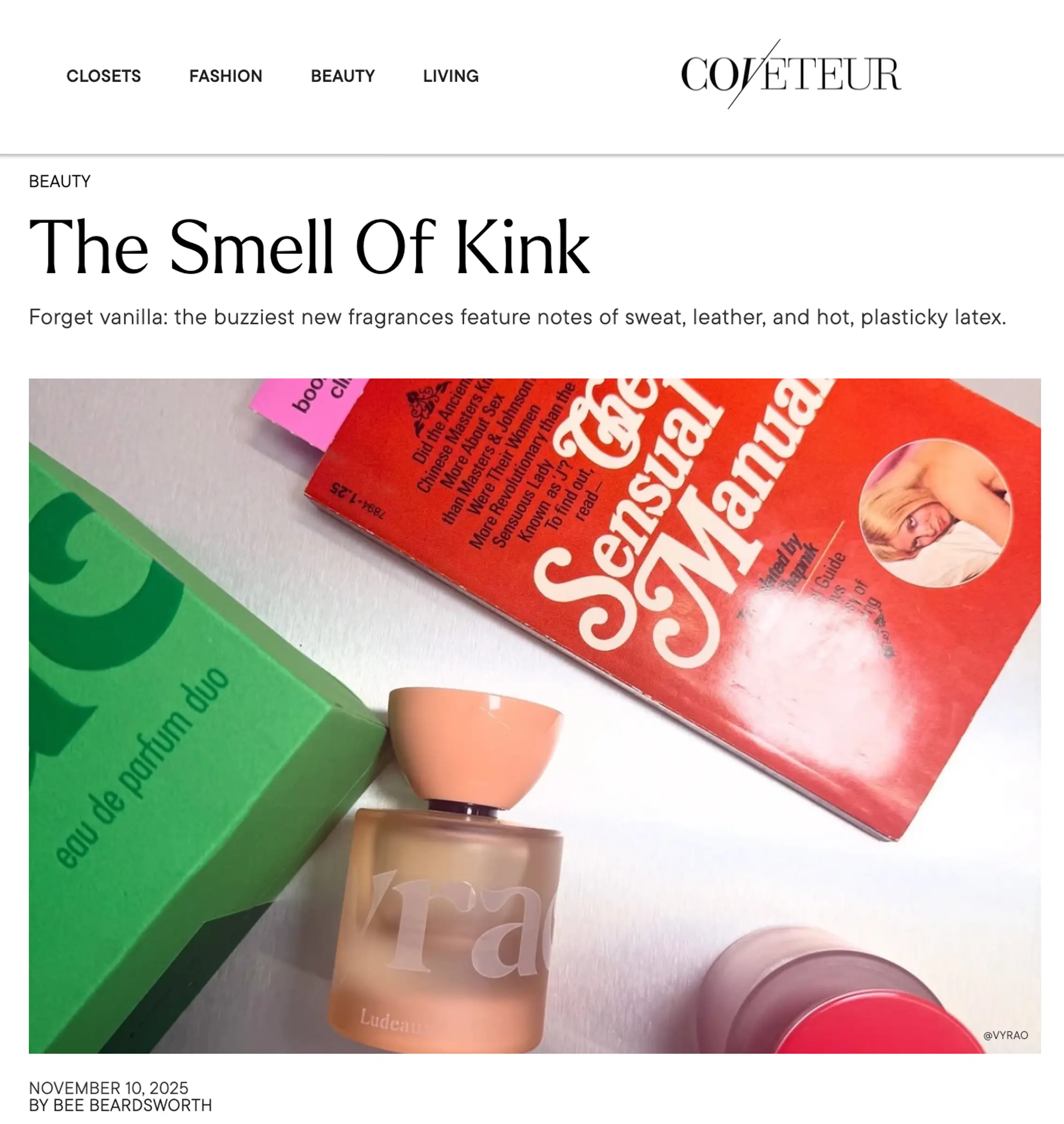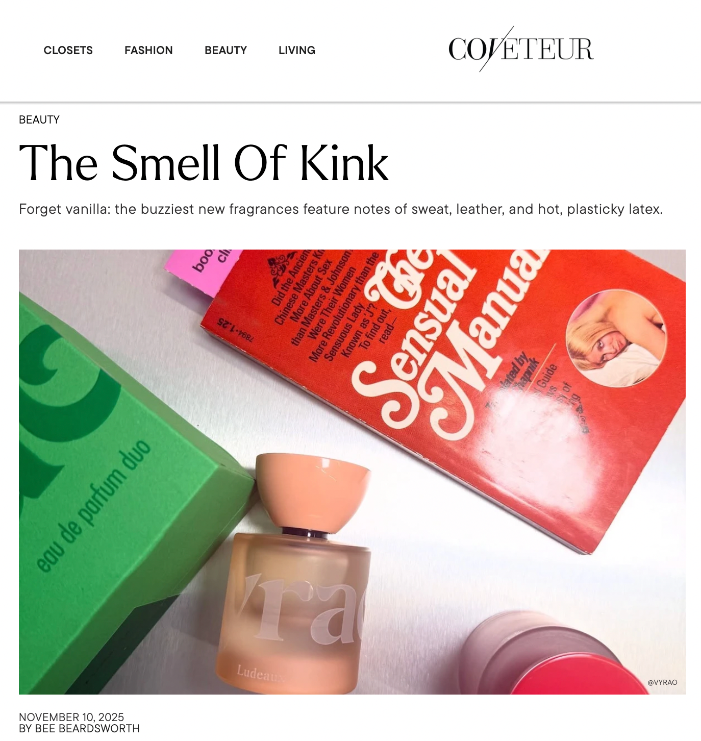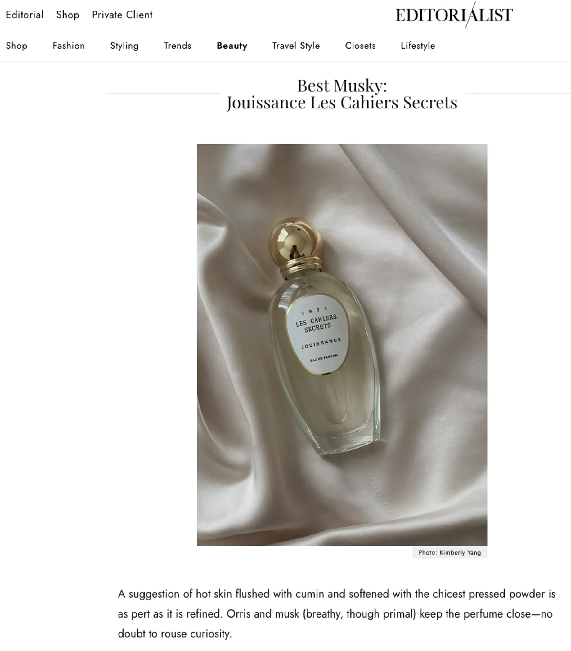 “Fragrances are entering into this space of taking control of sexuality, of owning sexuality and sensuality in a way that’s extremely personal,” [Douglas Little] continued. With this, brands and houses are approaching sexuality in new and innovative ways. For example, Jouissance, a fragrance brand created by Cherry Cheng, offers scents inspired by erotic literature from feminist trailblazers. For Cheng, employing these voices in her products is an intentional pivot from how the fragrance industry has historically approached sex.