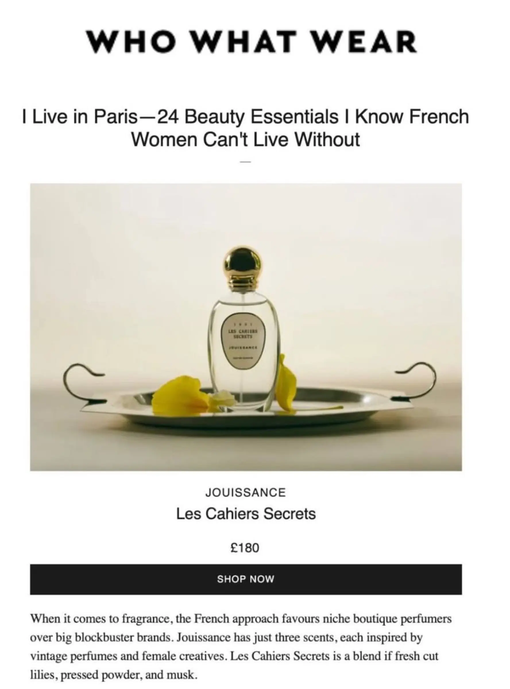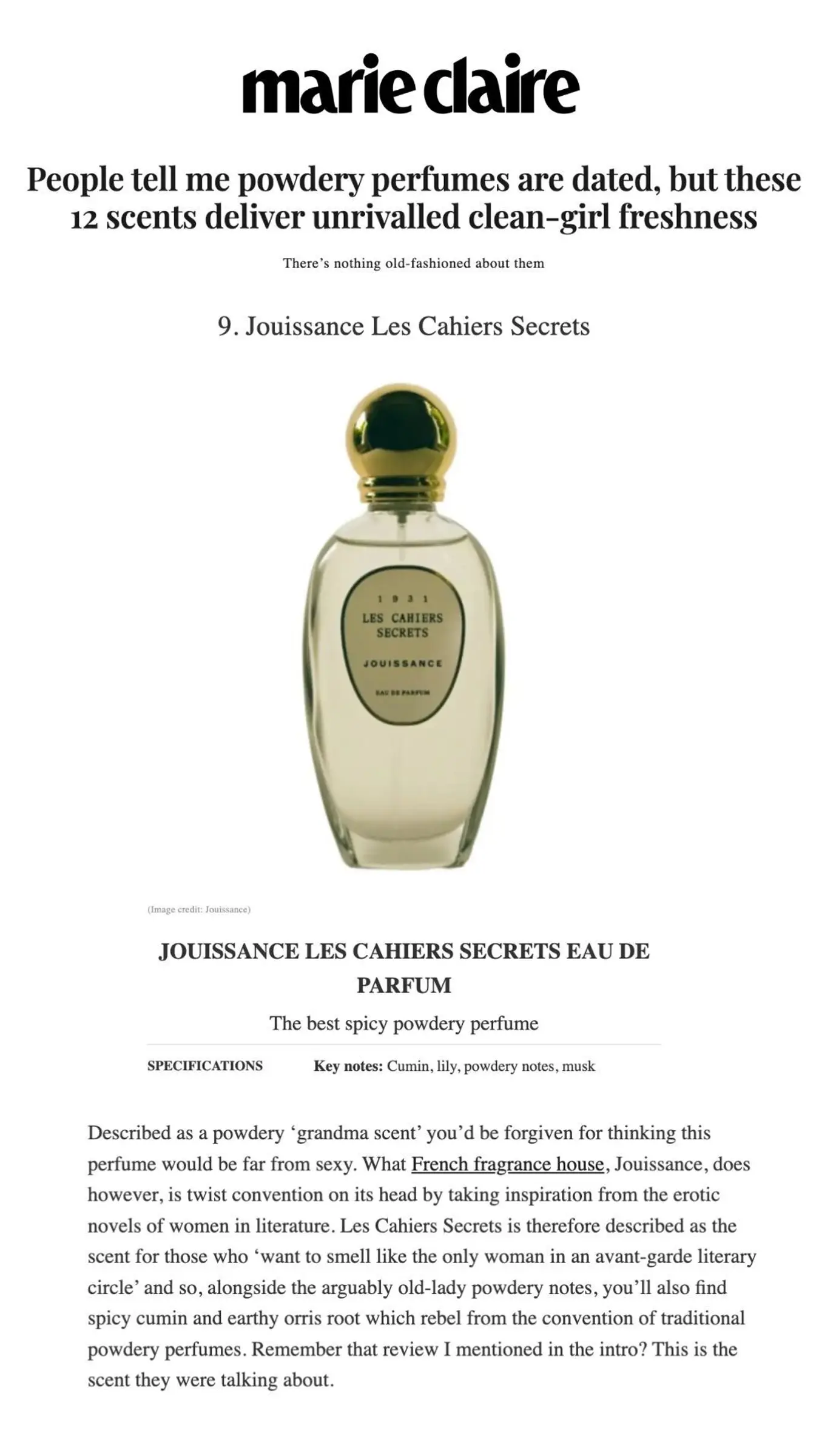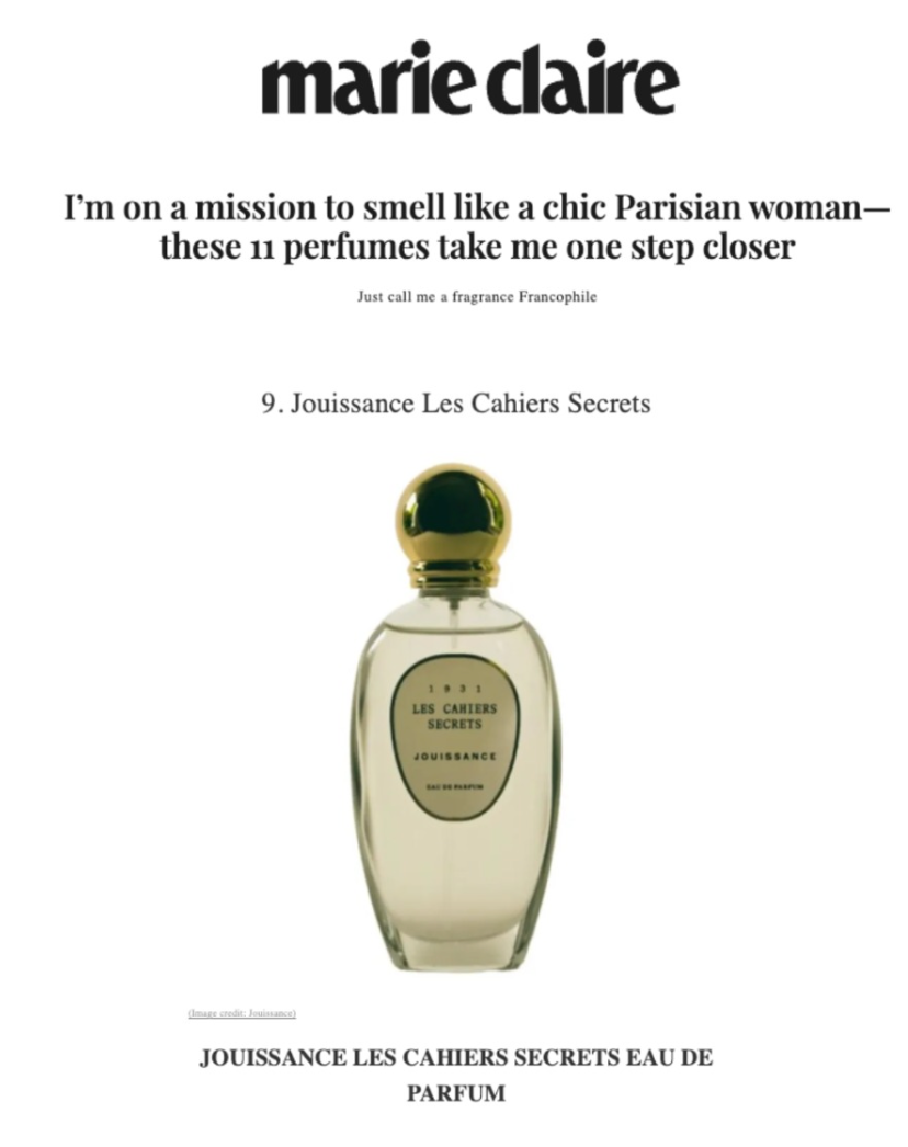 When it comes to fragrance, the French approach favours niche boutique perfumers over big blockbuster brands. Jouissance has just three scents, each inspired by vintage perfumes and female creatives. Les Cahiers Secrets is a blend if fresh cut lilies, pressed powder, and musk.