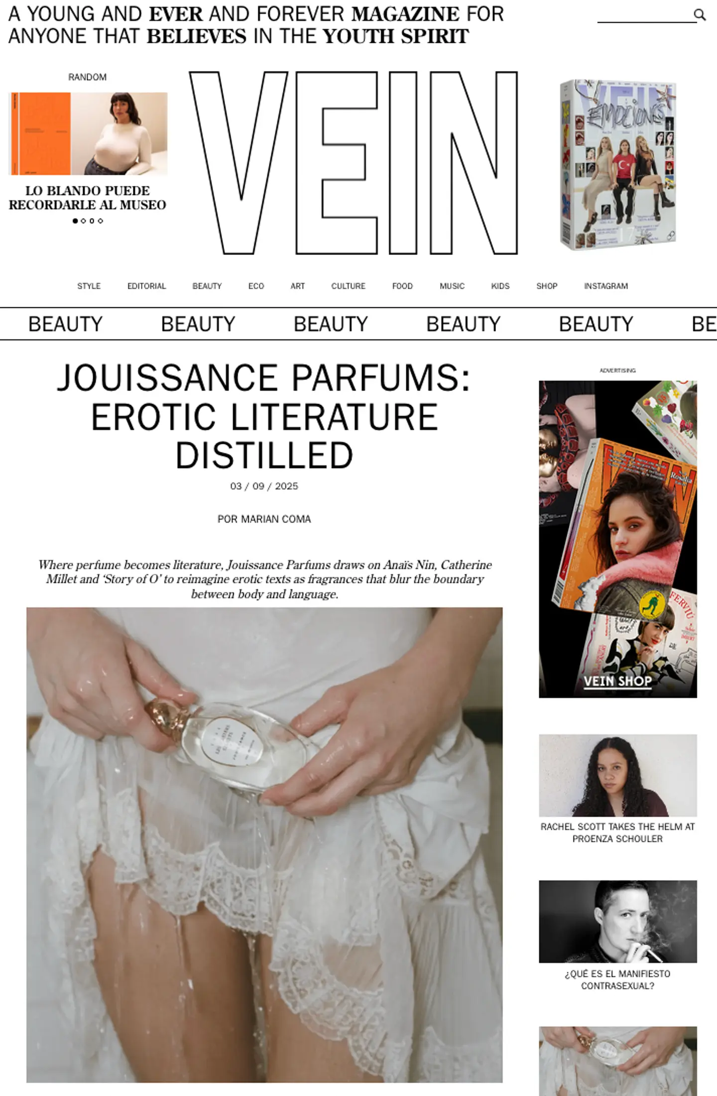 Beyond its bottles, Jouissance cultivates dialogue between scent, literature, and art. The house also offers a rotating selection of vintage books—including Nin’s diaries and Story of O—alongside limited-edition visual works that extend the tactile, poetic experience of its perfumes.