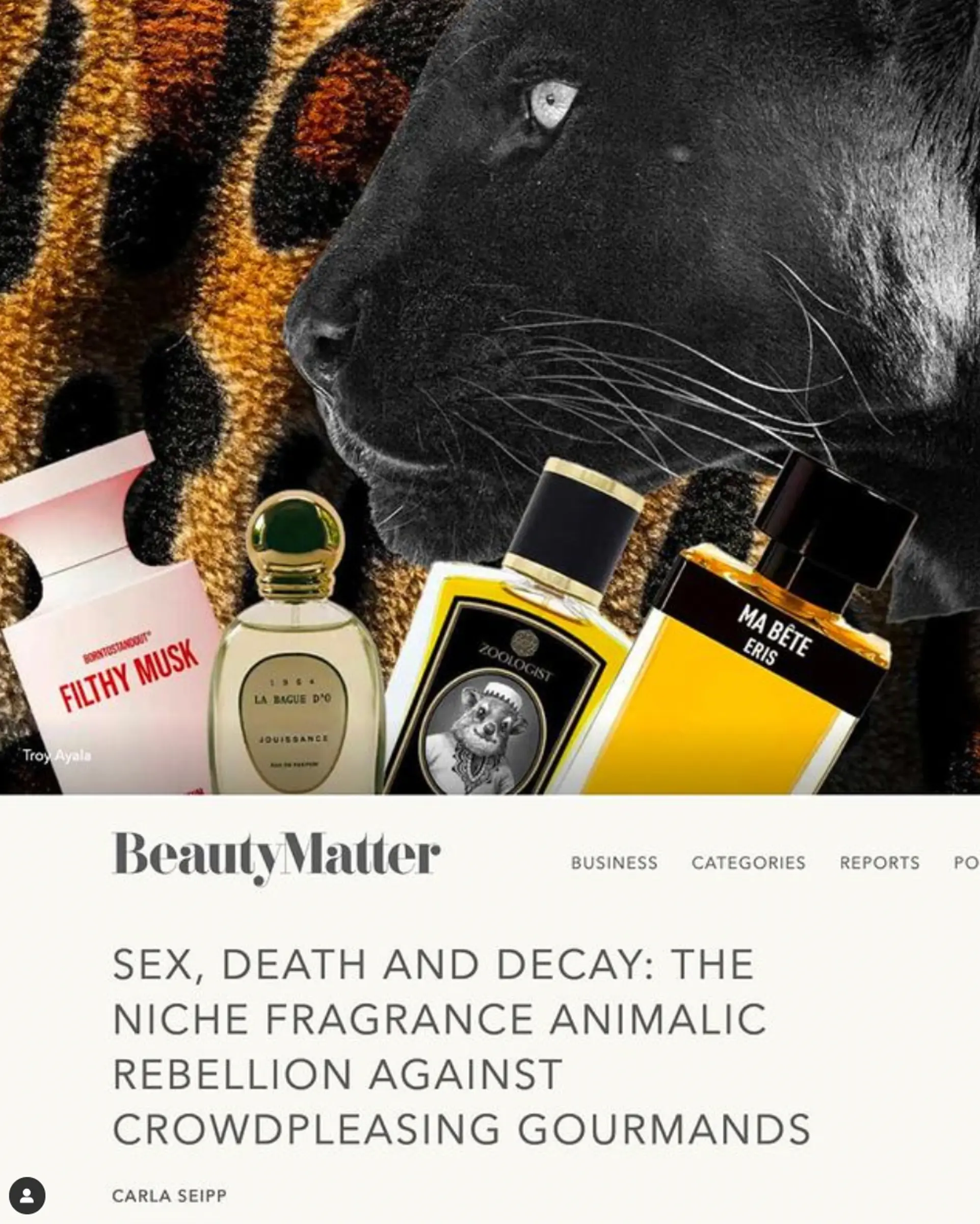 Defined by the use of originally animal-derived ingredients like civet, musk, castoreum, and hyraceum (although one could argue that oud and ambergris also carry animalic facets)—but now made possible through synthetic variants like skatole or plant-derived ingredients like indole—these scents have a certain funk to them. A funk that can border on the sweaty, fecal, or urine-like but in the right doses are downright sexy. After all, sex is not a sanitized act, so why should the fragrances emulating or alluding to it be censored? [... ] The 2024 brand launch, Jouissance, which focuses on female desire in literature and art throughout history, gives its scents like La Bague d’O an erotic edge with musks and animalic notes.