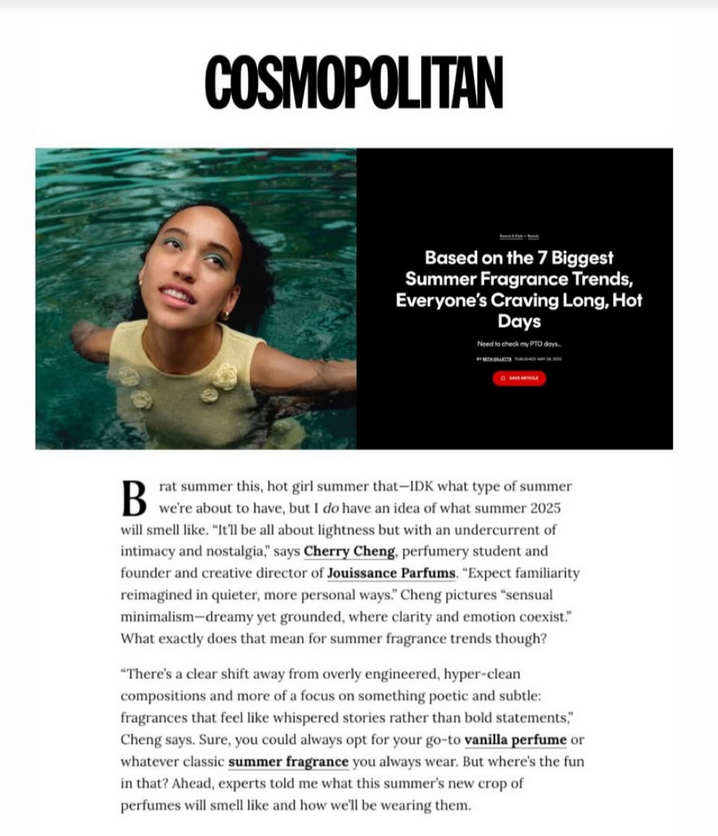 Brat summer this, hot girl summer that—IDK what type of summer we’re about to have, but I do have an idea of what summer 2025 will smell like. “It’ll be all about lightness but with an undercurrent of intimacy and nostalgia,” says Cherry Cheng, perfumery student and founder and creative director of Jouissance Parfums. “Expect familiarity reimagined in quieter, more personal ways.” Cheng pictures “sensual minimalism—dreamy yet grounded, where clarity and emotion coexist.”