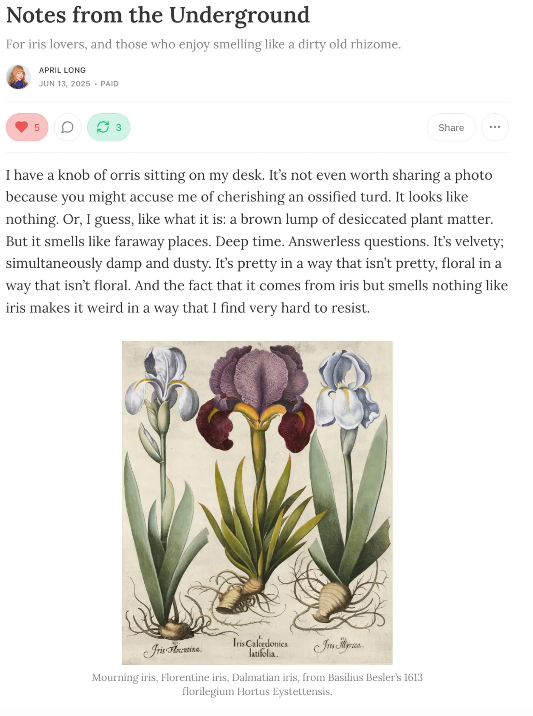 Due to its prohibitive cost, orris absolute is customarily used sparingly in perfumes, like a dollop of caviar. A perfumer needs to use enough so that it can cast its spell, but not so much that it makes the perfume too expensive... I love it in Jouissance's elegant Les Cahiers Secrets.