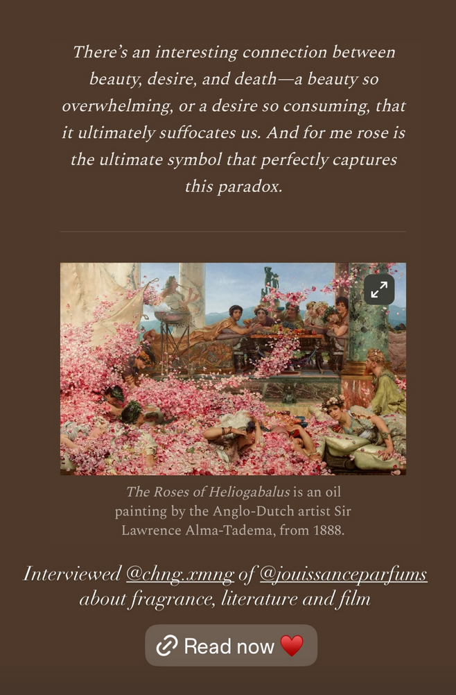 Speaking of Jouissance, a perfume brand I recently discovered through Instagram. I had the privilege of speaking to the founder, Cherry Cheng. We both share the love of both film and literature. I was able to smell her curated selection of perfumes beforehand and I can say they are amazing and so unique.