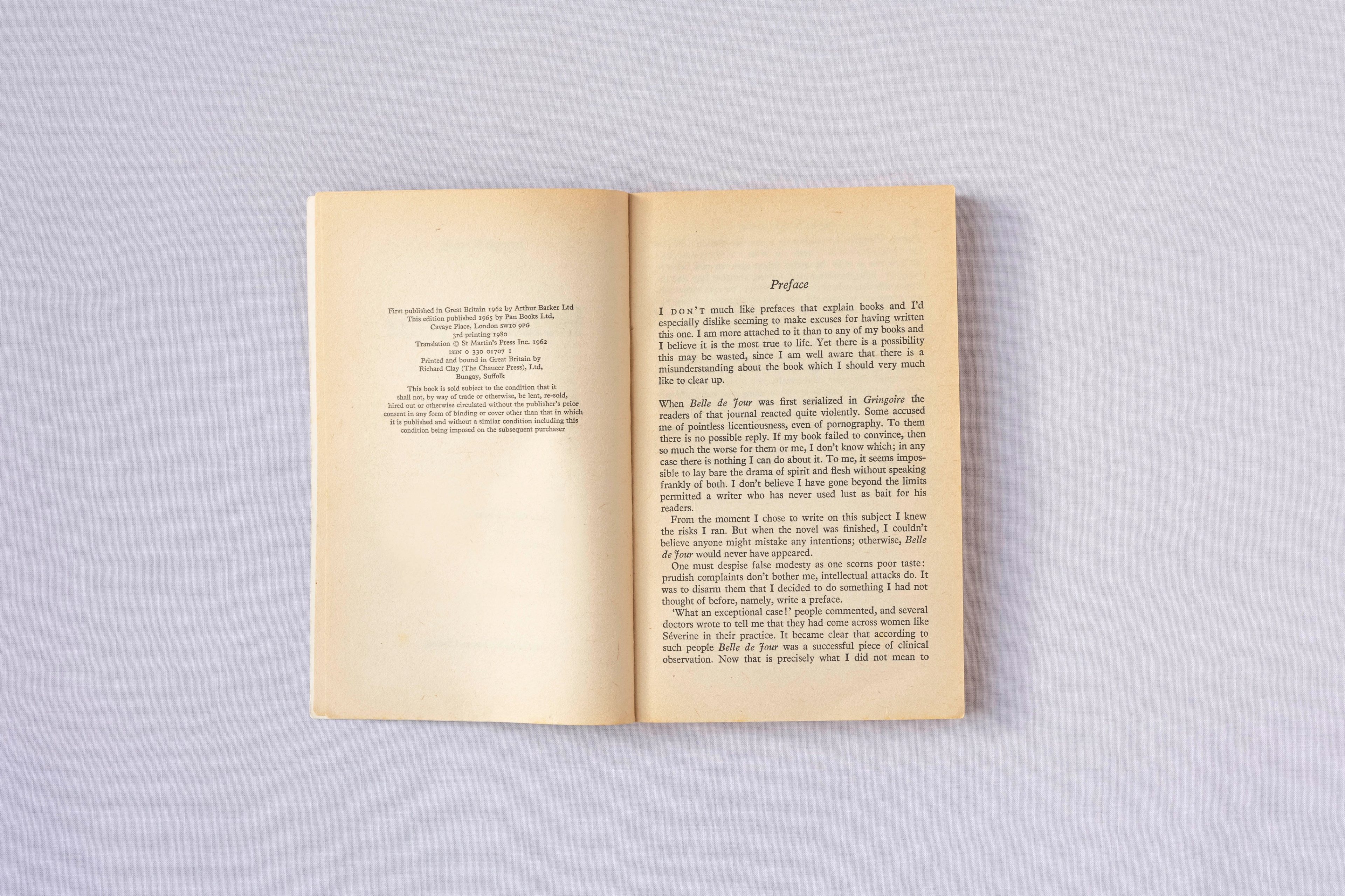 First serialised in the French political weekly Gringoire, where it achieved quite the succès de scandale, Belle de Jour didn’t receive an English translation until 1961. After Buñuel’s 1967 adaptation, it was thrust back into the spotlight, resulting in a spate of pulpy paperback editions, including this pretty 1969 Pan Macmillan edition, distinguished by its hazy, soft-focused cover photo.