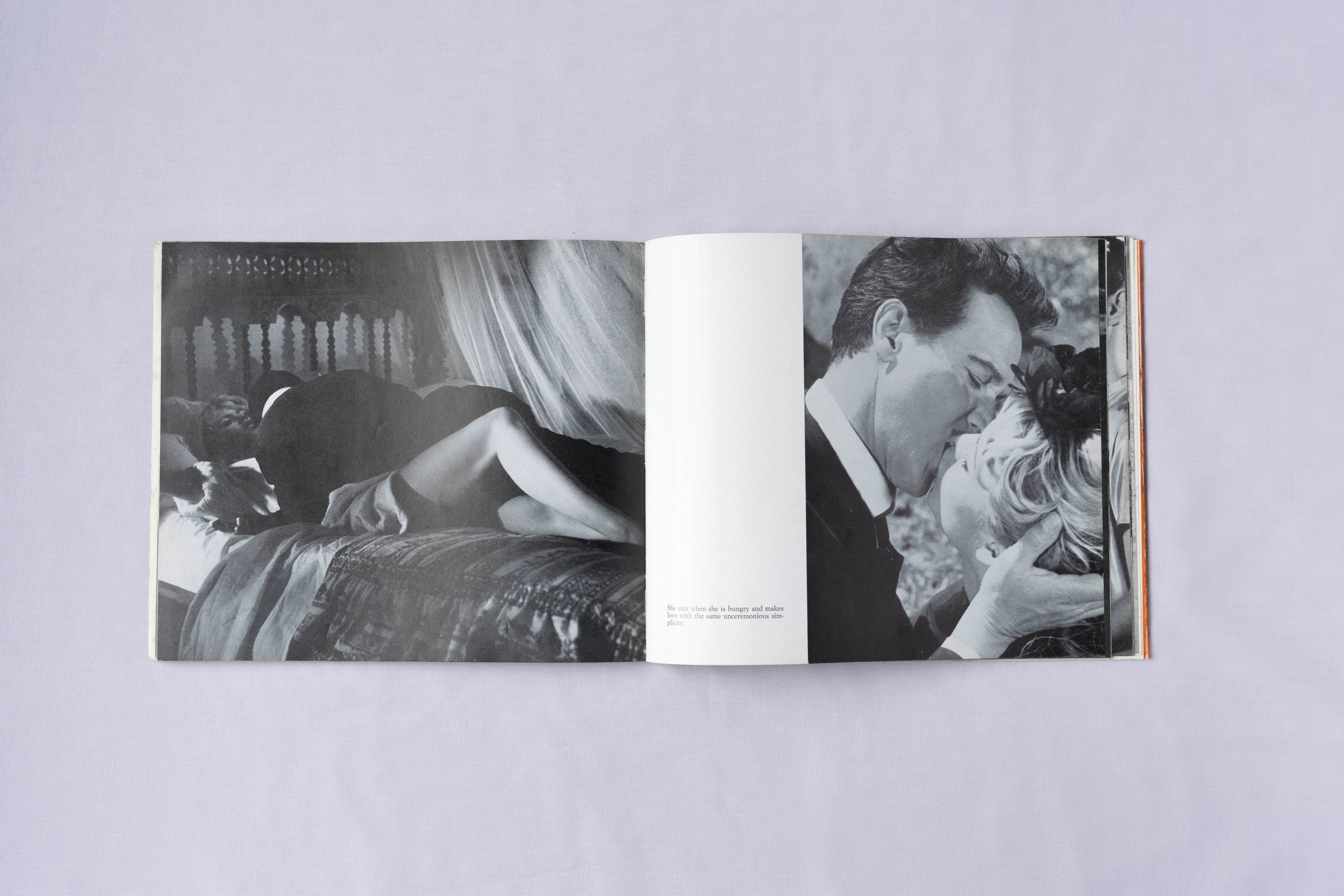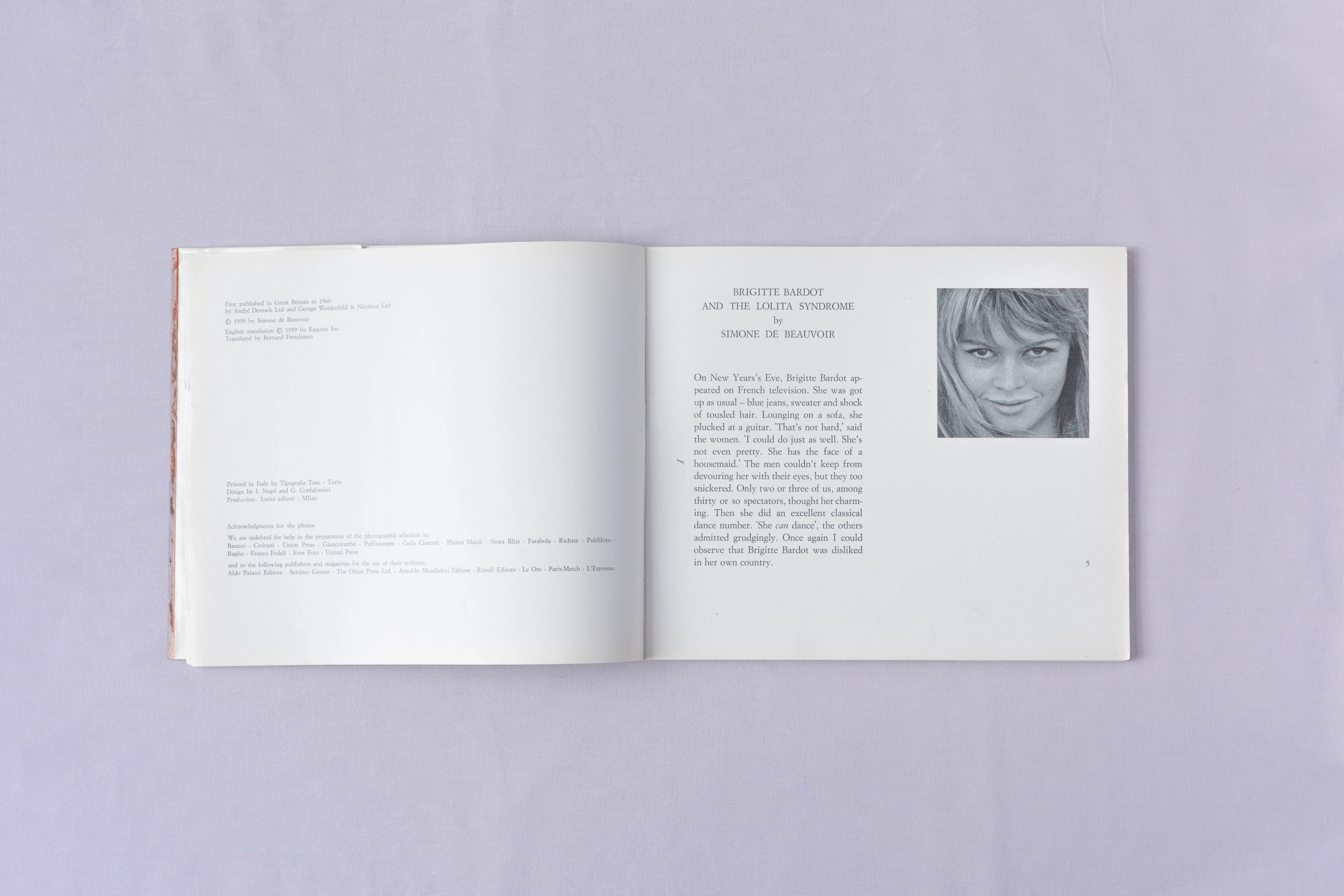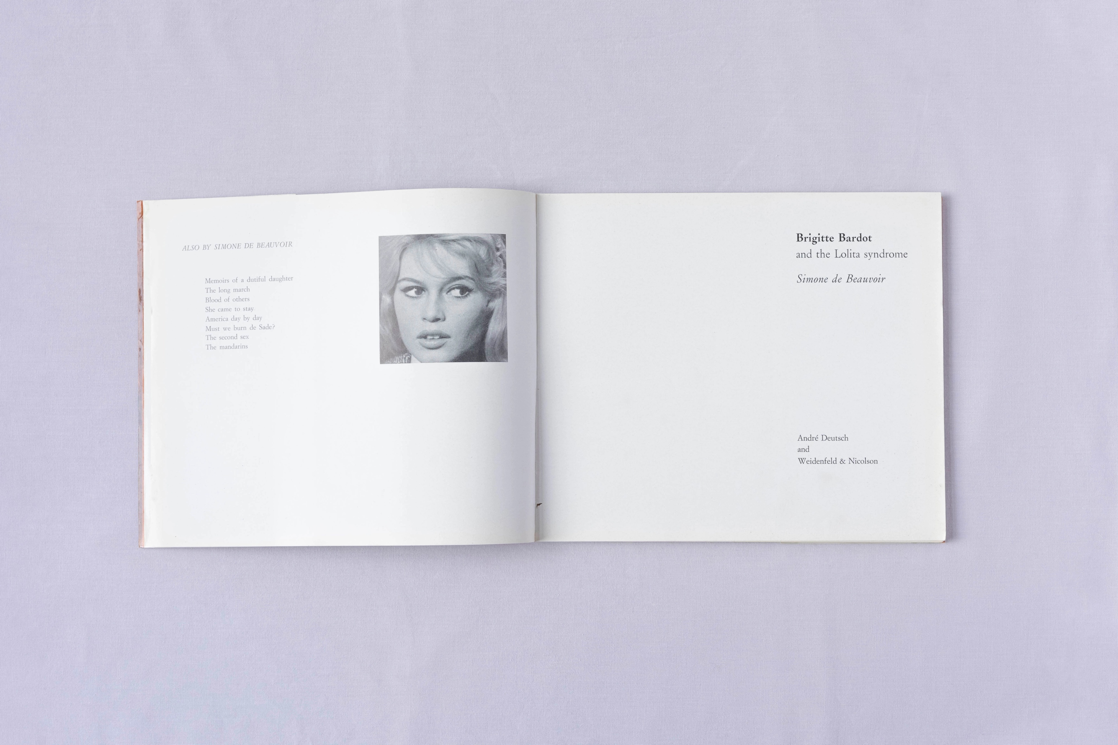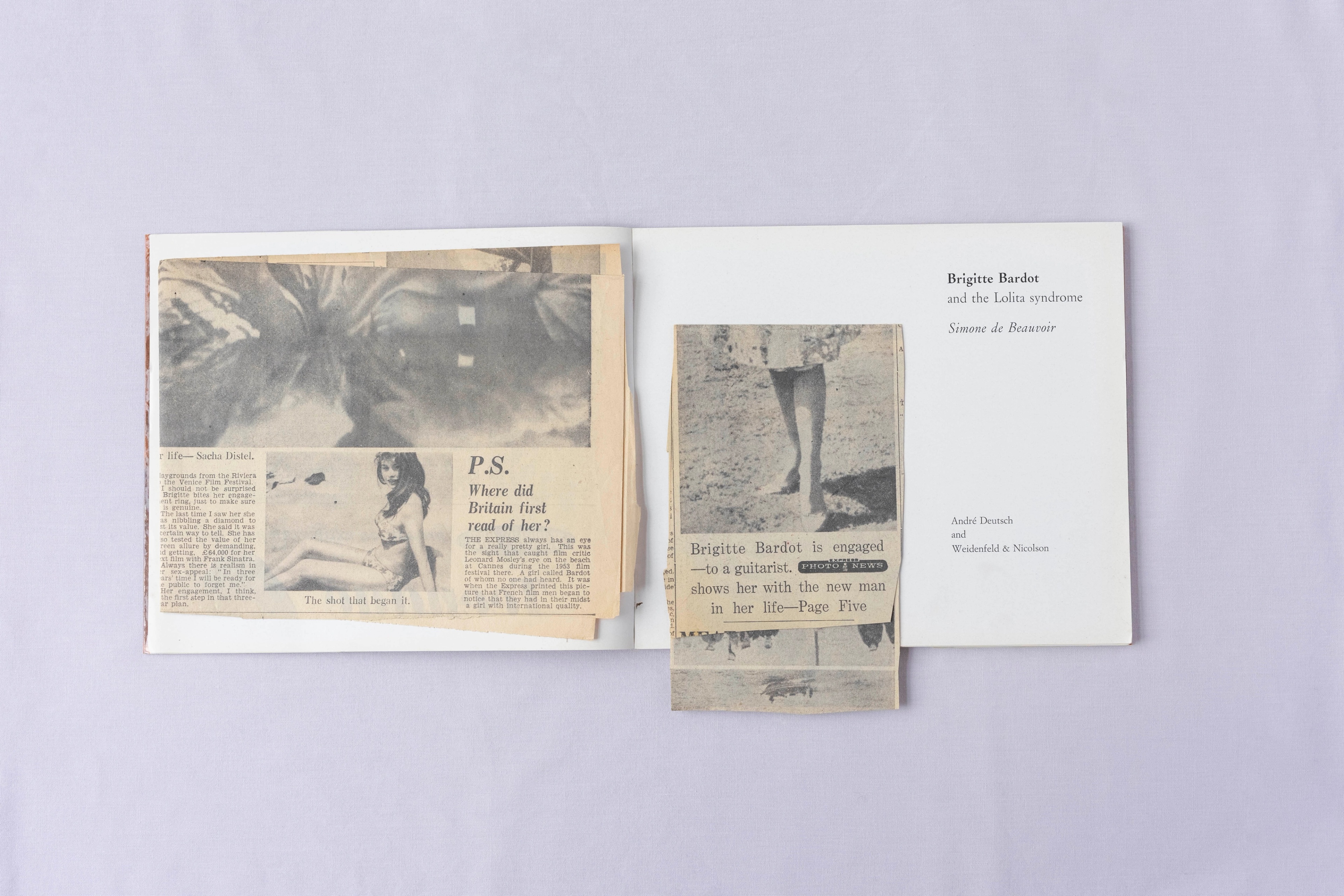 Brigitte Bardot and the Lolita Syndrome was first written for the August 1959 issue of Esquire magazine, then swiftly released in book form to capitalise on the fame of both author and subject. In this UK First Edition, printed in softback by André Deutsch Ltd, De Beauvoir’s essay is transformed into a photo book, with glossy black and white images of Bardot filling almost every page. This edition also includes a newspaper article from the Daily Express, Tuesday the 9th September 1958, reporting Bardot’s engagement. It must have been owned by a true Bardot fan.