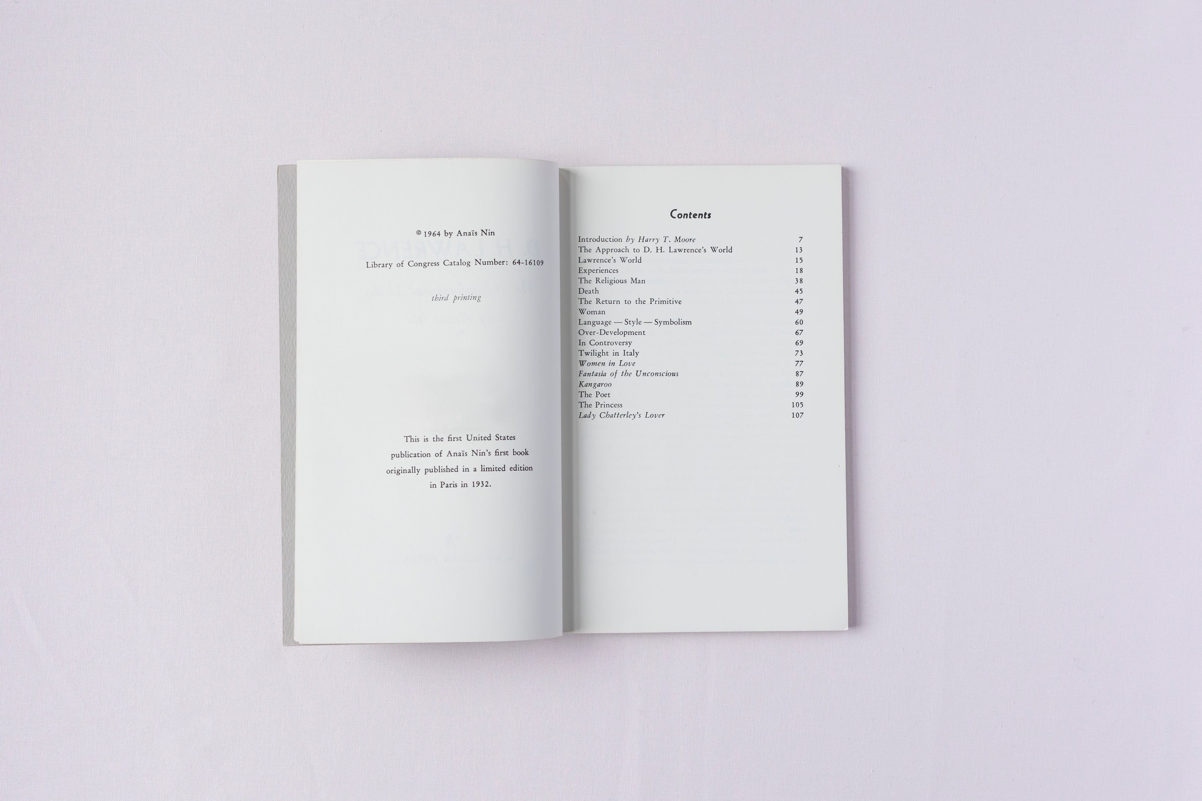 Anaïs Nin’s first published book, D. H. Lawrence: An Unprofessional Study (1932), was a typically radical work, defending an author few at the time were willing to champion. Rather than adopting the distance of literary criticism, Nin wrote as a devotee, allowing her fascination with Lawrence to come through. Published in a tiny run, the book has become a small but important piece of literary history – an early signal of the themes and instincts Nin would pursue throughout her own writing life.