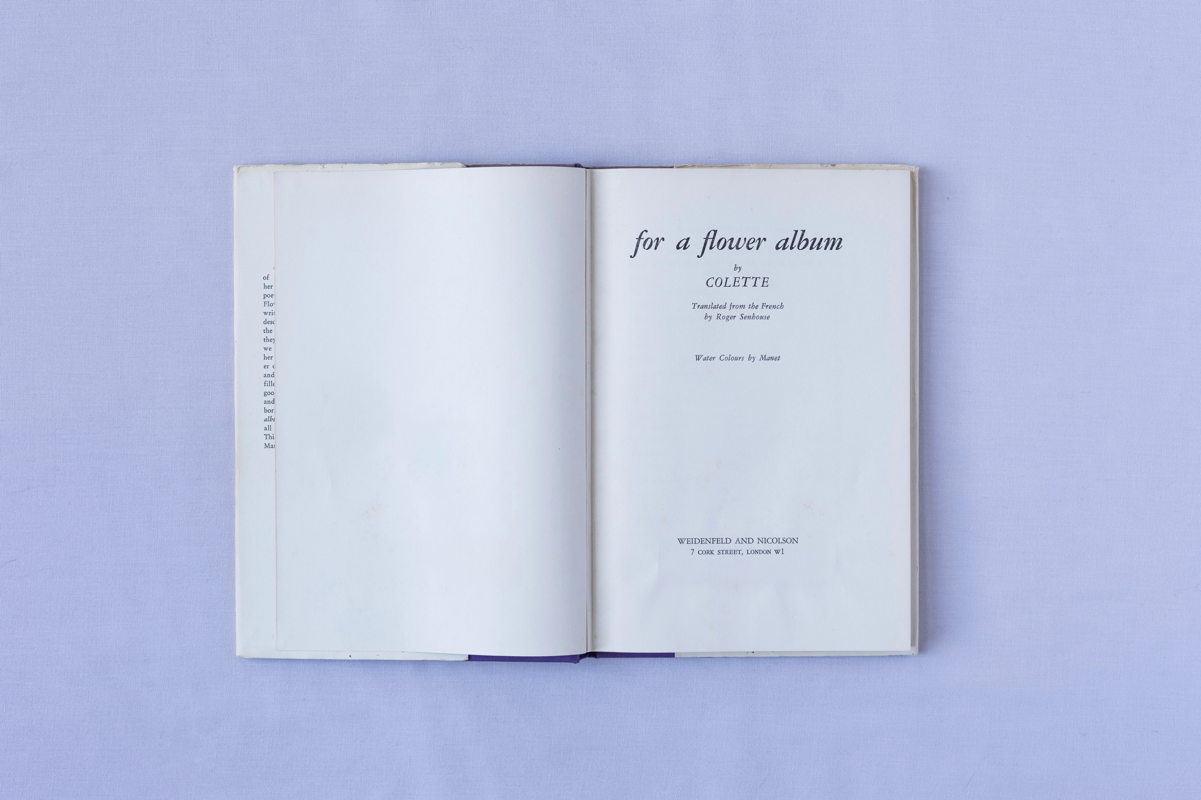 For a Flower Album began as a project between the writer Colette and her publisher Mermod. He sent her bouquets once or twice a week, inviting her to trace the portrait of each, which became the foundation for a delicate, charming collection of prose pieces, illustrated with a selection of floral Manet watercolours. As the blurb notes: