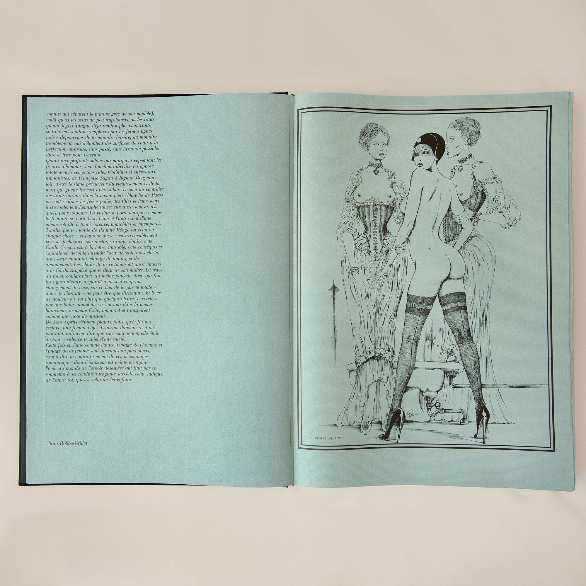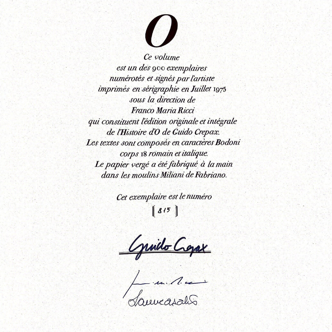 Best known as the creator of Valentina, a famed erotic comic strip heroine of the 1960s, Guido Crepax was an Italian architect and master erotic cartoonist. Through his work, Crepax sought to challenge and disrupt the sexual repression of an Italian society dominated by the doctrine of Catholicism. His 1975 adaptation of Story of O was more than merely an illustration of the text. His longest graphic novel, the story is adapted in its entirety in the artist's trademark elegant style, with quotes from the original text alongside those of Freud and other sources on eroticism. This rare edition also includes introductions from philosopher Roland Barthes and writer and filmmaker Alain Robbe-Grillet.