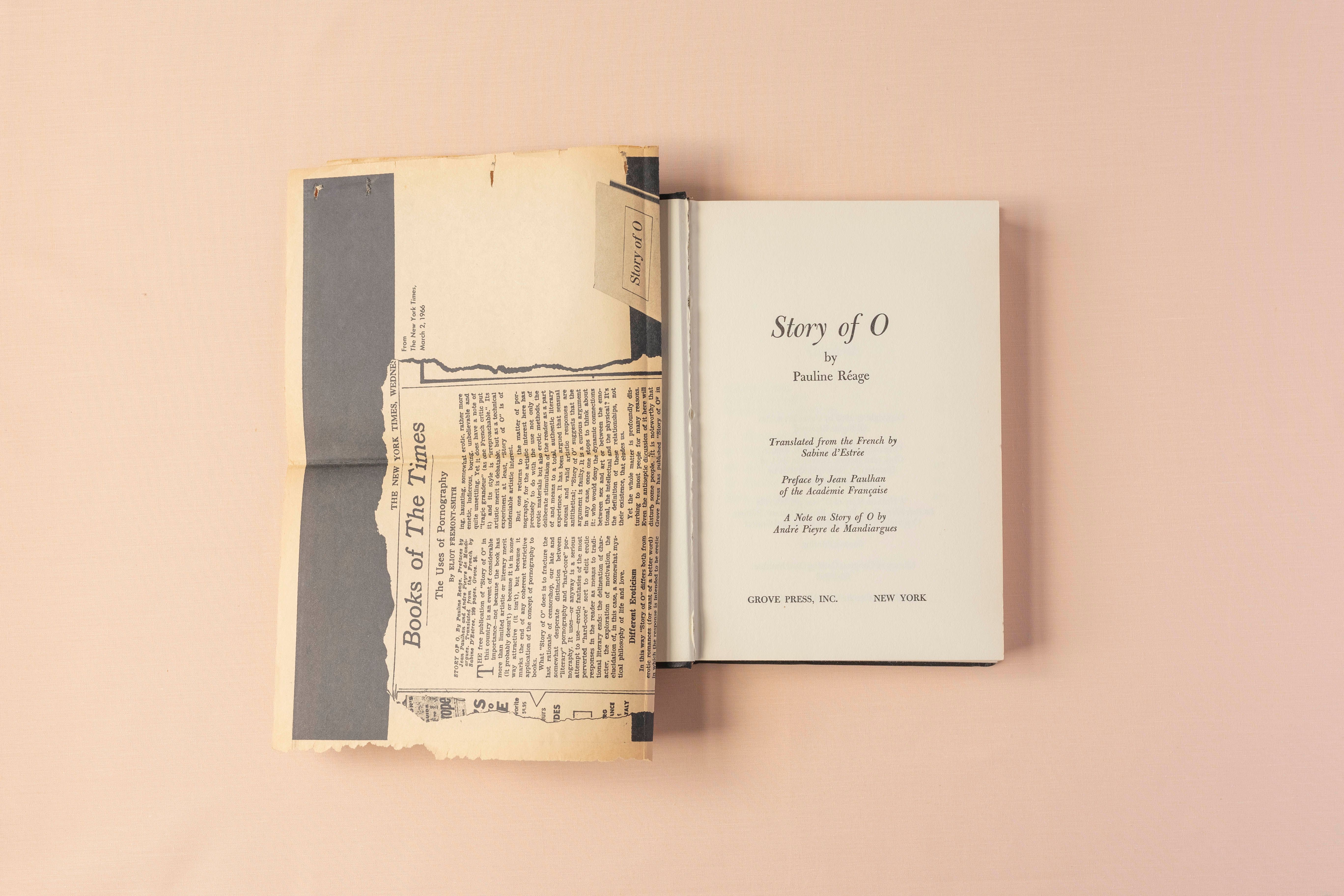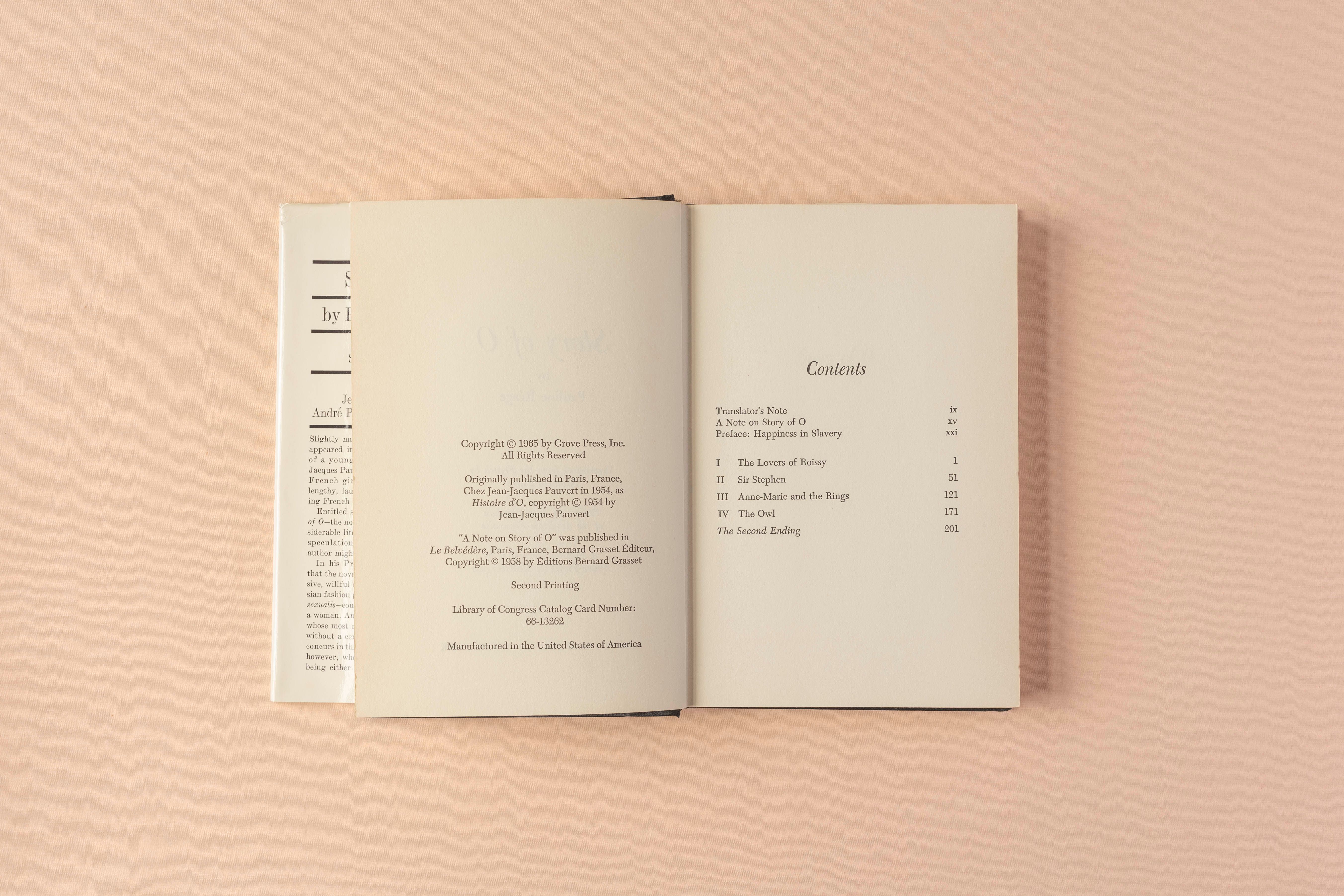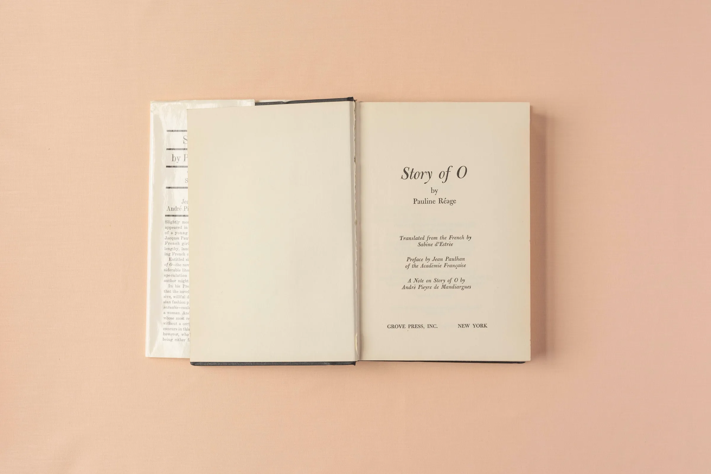 This is the First US hardcover edition released by Grove Press in 1965, the book’s first official appearance in the American market. Wrapped in a minimal, white dustcover, the edition includes a translator’s note (by Richard Seaver under the pen name Sabine d’Estrée), and ‘A Note on Story of O’ by critic and collector of erotica André Pieyre de Mandiargues, along with the dark, fatalistic ‘second ending’ that Réage wrote after the novel’s initial publication.