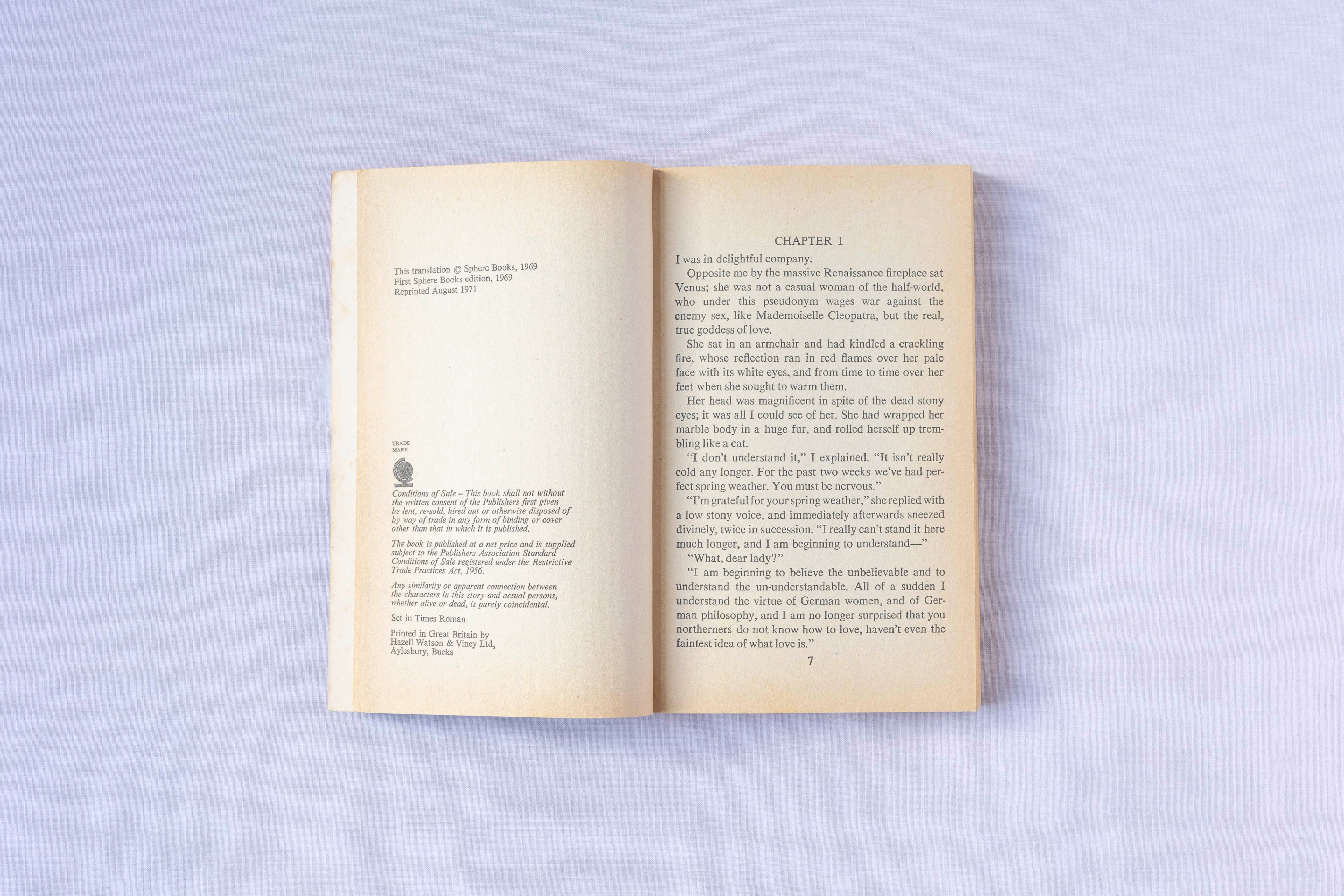 While Luxor Press issued the first unexpurgated English translation in 1965, the prize for prettiest surely goes to Sphere Books, whose reprinted 1971 edition features a pulpy illustration of Sacher-Masoch’s dream tormentor.